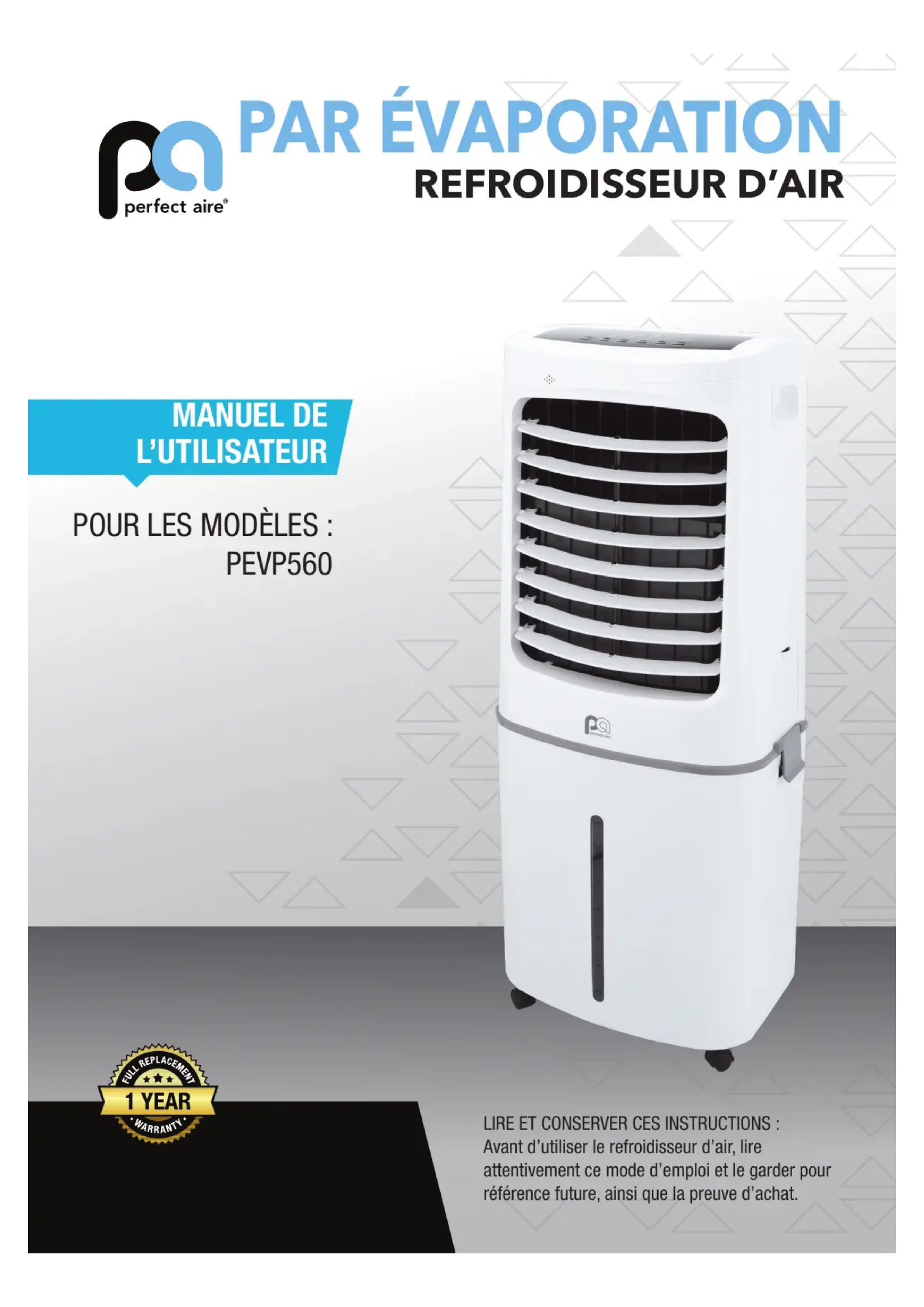 MANUEL DE L’UTILISATEUR POUR LES MODÈLES : PEVP560 LIRE ET CONSERVER CES INSTRUCTIONS : Avant d’utiliser le refroidisseur d’air, lire attentivement ce mode d’emploi et le garder pour référence future, ainsi que la preuve d’achat. PAR ÉVAPORATION