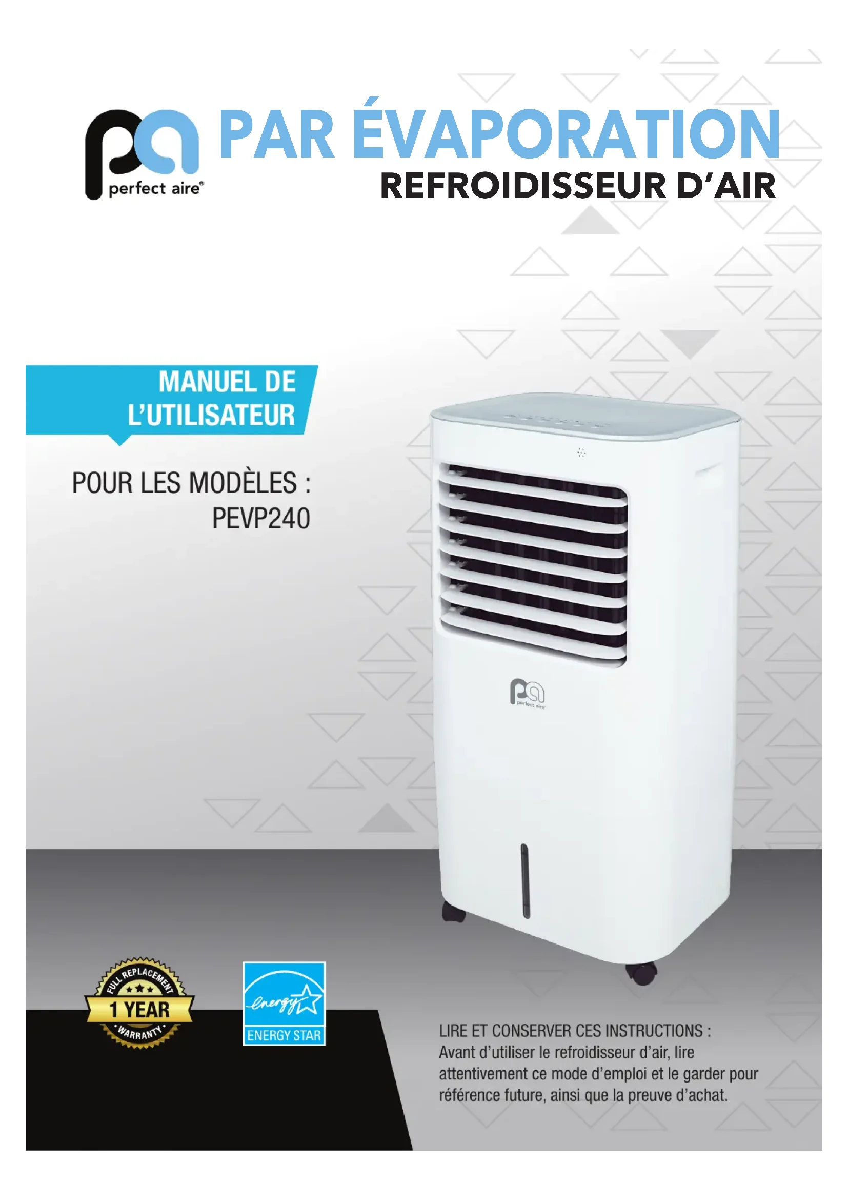 MANUEL DE L’UTILISATEUR POUR LES MODÈLES : PEVP240 LIRE ET CONSERVER CES INSTRUCTIONS : Avant d’utiliser le refroidisseur d’air, lire attentivement ce mode d’emploi et le garder pour référence future, ainsi que la preuve d’achat. PAR ÉVAPORATION