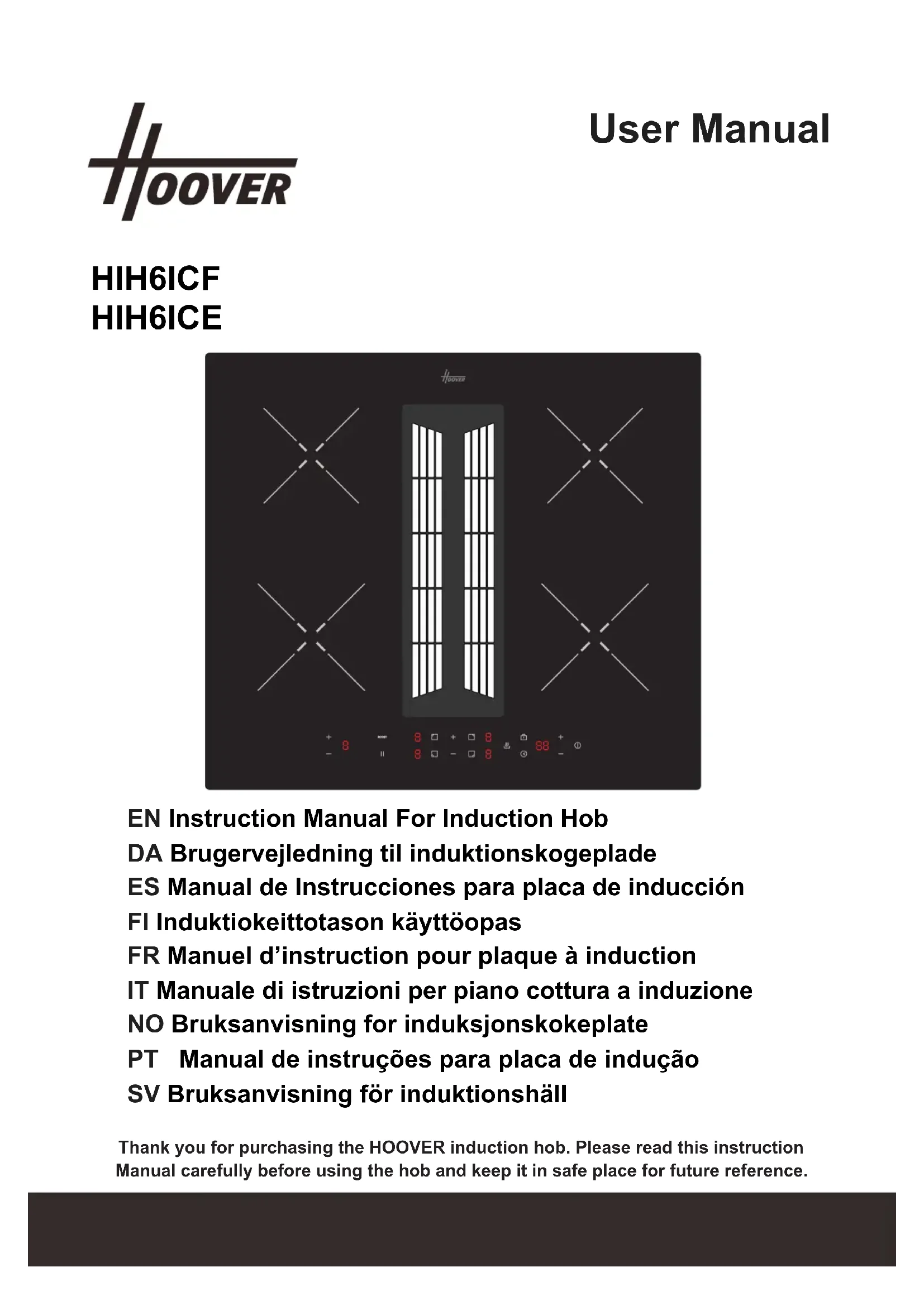 la plaque signalétique. Pour brancher la plaque sur le secteur, n’utilisez pas d’adaptateurs, de réducteurs ou de dispositifs de branchement, car ils peuvent provoquer une surchauffe et un incendie. Le câble d’alimentation ne doit toucher aucune des parties chaudes et doit être positionné de manière à ce que la température ne dépasse jamais 75 °C.180 Déclaration spéciale Le contenu de ce manuel a été soigneusement vérifié. Toutefois, l’entreprise ne peut être tenue pour responsable d’aucune erreur d’impression ou omission. En outre, toute modification technique peut être incluse dans une version révisée du manuel sans préavis. L’apparence et la couleur de l’appareil dans ce manuel peuvent différer de celles de votre appareil. Cet appareil est étiqueté conformément à la Directive européenne 2012/19/UE relative aux déchets d’équipements électriques et électroniques (DEEE). Les DEEE contiennent à la fois des substances polluantes (pouvant avoir un effet négatif sur l’environnement) et des éléments de base (pouvant être réutilisés). Il est important que les DEEE fassent l’objet de traitements spécifiques pour enlever et mettre au rebut les polluants et pour récupérer tous les matériaux. Chaque personne peut jouer un rôle important en s’ assurant que les DEEE ne deviennent pas un problème environnemental ; il est essentiel de suivre quelques règles de base : - les DEEE ne doivent pas être traités comme des déchets ménagers ; - les DEEE doivent être amenés sur des sites de collecte spéciaux (déchetteries) gérés par votre collectivité ou une entreprise agréée. Dans de nombreux pays, les collectes chez les particuliers peuvent être disponibles pour les grands DEEE. Lors de l’achat d’un nouvel appareil, l’ancien peut être retourné au vendeur qui doit l’accepter gratuitement sous forme d’échange, à condition que l’appareil soit d’un type équivalent et qu’il possède les mêmes fonctions que l’appareil acheté. Valable uniquement pour ChypreManuale d’uso Grazie per aver acquistato un piano cottura a induzione HOOVER. Prima di utilizzare il piano cottura, leggere attentamente questo manuale di istruzioni e conservarlo in un luogo sicuro per poterlo consultare in seguito.181 SOMMARIO