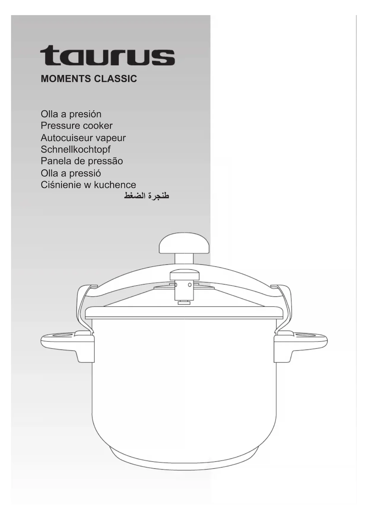 REIL - Les matériaux constituant l’emballage de cet appareil font partie d’un programme de collecte, de tri et de recyclage. Pour vous débarrasser du produit, merci de bien vouloir utiliser les conteneurs publics appropriés à chaque type de matériau. - Le produit ne contient pas de substances concentrées susceptibles d’être considérées comme nuisibles à l’environnement. - Ce produit est conforme à la Directive 97/23/ EC des Récipients à Pression. Anomalies Causes Solutions La soupape régulatrice de pression fait un bruit et n’expulse pas de vapeur après chauage de l’autocuiseur. Bouchonnement de la soupape régulatrice de pression Bouchonnement du tuyau de sortie d’air Cuisson sans liquide Inclinaison de la source de chaleur Nettoyer la soupape régulatrice de pression Nettoyer la saleté Éteindre immédiatement la source de chaleur, retirer l’autocuiseur et vérier le système. Chauer l’autocuiseur sur une source de chaleur plate et stable. La soupape de sécurité expulse de la vapeur ou du liquide. Bouchonnement du tuyau de sortie d’air. L’autocuiseur est trop plein La source de chaleur est trop forte Nettoyer la saleté Réduire le volume de remplissage Régler la source de chaleur à la vapeur expulsée par la soupape de pression. La soupape de pression ne monte pas. Le couvercle n’est pas positionné correctement La puissance de la source de chaleur est trop faible Le joint est sale, endommagé ou déformé La quantité d’eau est insusante. Positionner le couvercle correctement Augmenter la puissance de la source de chaleur Nettoyer ou remplacer le joint Vérier la quantité d’eau. Le couvercle ne ferme pas bien Le couvercle s’est déformé Changer le couvercleDeutsch MOMENTS CLASSIC Schnellkochtopf Sehr geehrte Kunden, vielen Dank für Ihr Vertrauen in die Marke TAURUS. Die Technologie, das Design und die Funktio- nalität dieses Produkts, das die anspruchs- vollsten Qualitätsnormen erfüllt, werden Sie über viele Jahre zufriedenstellen. BEZEICHNUNG