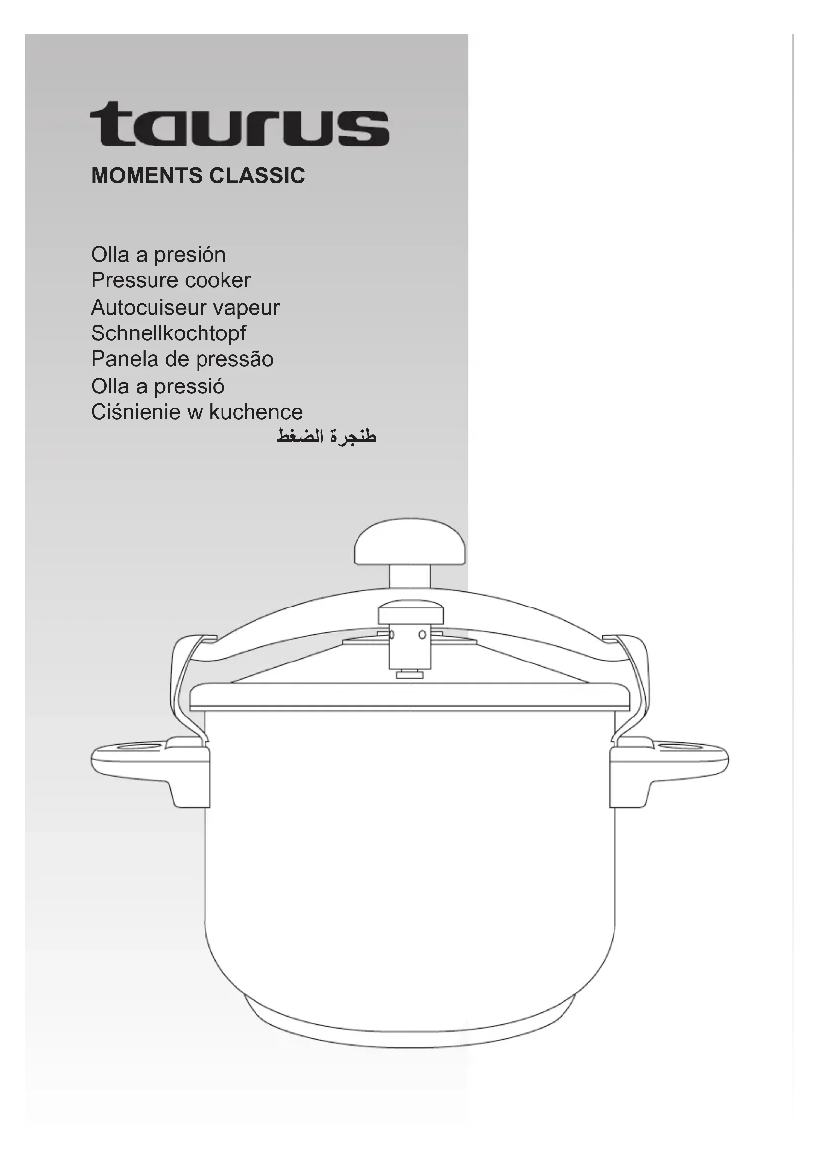 REIL - Les matériaux constituant l’emballage de cet appareil font partie d’un programme de collecte, de tri et de recyclage. Pour vous débarrasser du produit, merci de bien vouloir utiliser les conteneurs publics appropriés à chaque type de matériau. - Le produit ne contient pas de substances concentrées susceptibles d’être considérées comme nuisibles à l’environnement. - Ce produit est conforme à la Directive 97/23/ EC des Récipients à Pression. Anomalies Causes Solutions La soupape régulatrice de pression fait un bruit et n’expulse pas de vapeur après chauage de l’autocuiseur. Bouchonnement de la soupape régulatrice de pression Bouchonnement du tuyau de sortie d’air Cuisson sans liquide Inclinaison de la source de chaleur Nettoyer la soupape régulatrice de pression Nettoyer la saleté Éteindre immédiatement la source de chaleur, retirer l’autocuiseur et vérier le système. Chauer l’autocuiseur sur une source de chaleur plate et stable. La soupape de sécurité expulse de la vapeur ou du liquide. Bouchonnement du tuyau de sortie d’air. L’autocuiseur est trop plein La source de chaleur est trop forte Nettoyer la saleté Réduire le volume de remplissage Régler la source de chaleur à la vapeur expulsée par la soupape de pression. La soupape de pression ne monte pas. Le couvercle n’est pas positionné correctement La puissance de la source de chaleur est trop faible Le joint est sale, endommagé ou déformé La quantité d’eau est insusante. Positionner le couvercle correctement Augmenter la puissance de la source de chaleur Nettoyer ou remplacer le joint Vérier la quantité d’eau. Le couvercle ne ferme pas bien Le couvercle s’est déformé Changer le couvercleDeutsch MOMENTS CLASSIC Schnellkochtopf Sehr geehrte Kunden, vielen Dank für Ihr Vertrauen in die Marke TAURUS. Die Technologie, das Design und die Funktio- nalität dieses Produkts, das die anspruchs- vollsten Qualitätsnormen erfüllt, werden Sie über viele Jahre zufriedenstellen. BEZEICHNUNG