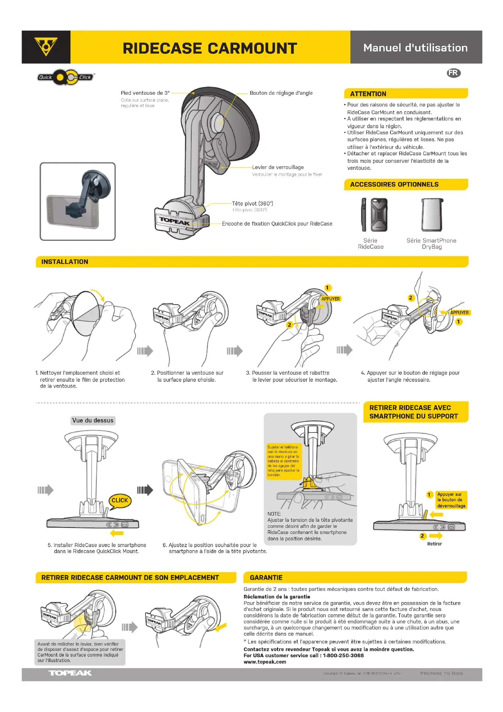 GARANTIE INSTALLATION Garantie de 2 ans : toutes parties mécaniques contre tout défaut de fabrication.Réclamation de la garantiePour bénéficier de notre service de garantie, vous devez être en possession de la facture d'achat originale. Si le produit nous est retourné sans cette facture d'achat, nous considérons la date de fabrication comme début de la garantie. Toute garantie sera considérée comme nulle si le produit à été endommagé suite à une chute, à un abus, une surcharge, à un quelconque changement ou modification ou à une utilisation autre que celle décrite dans ce manuel.* Les spécifications et l'apparence peuvent être sujettes à certaines modifications.Contactez votre revendeur Topeak si vous avez la moindre question. For USA customer service call : 1-800-250-3068www.topeak.com1. Nettoyer l'emplacement choisi et retirer ensuite le film de protection de la ventouse.2. Positionner la ventouse sur la surface plane choisie.3. Pousser la ventouse et rabattre le levier pour sécuriser le montage.4. Appuyer sur le bouton de réglage pour ajuster l'angle nécessaire.5. Installer RideCase avec le smartphone dans le Ridecase QuickClick Mount.6. Ajustez la position souhaitée pour le smartphone à l'aide de la tête pivotante. Vue du dessus CLICK