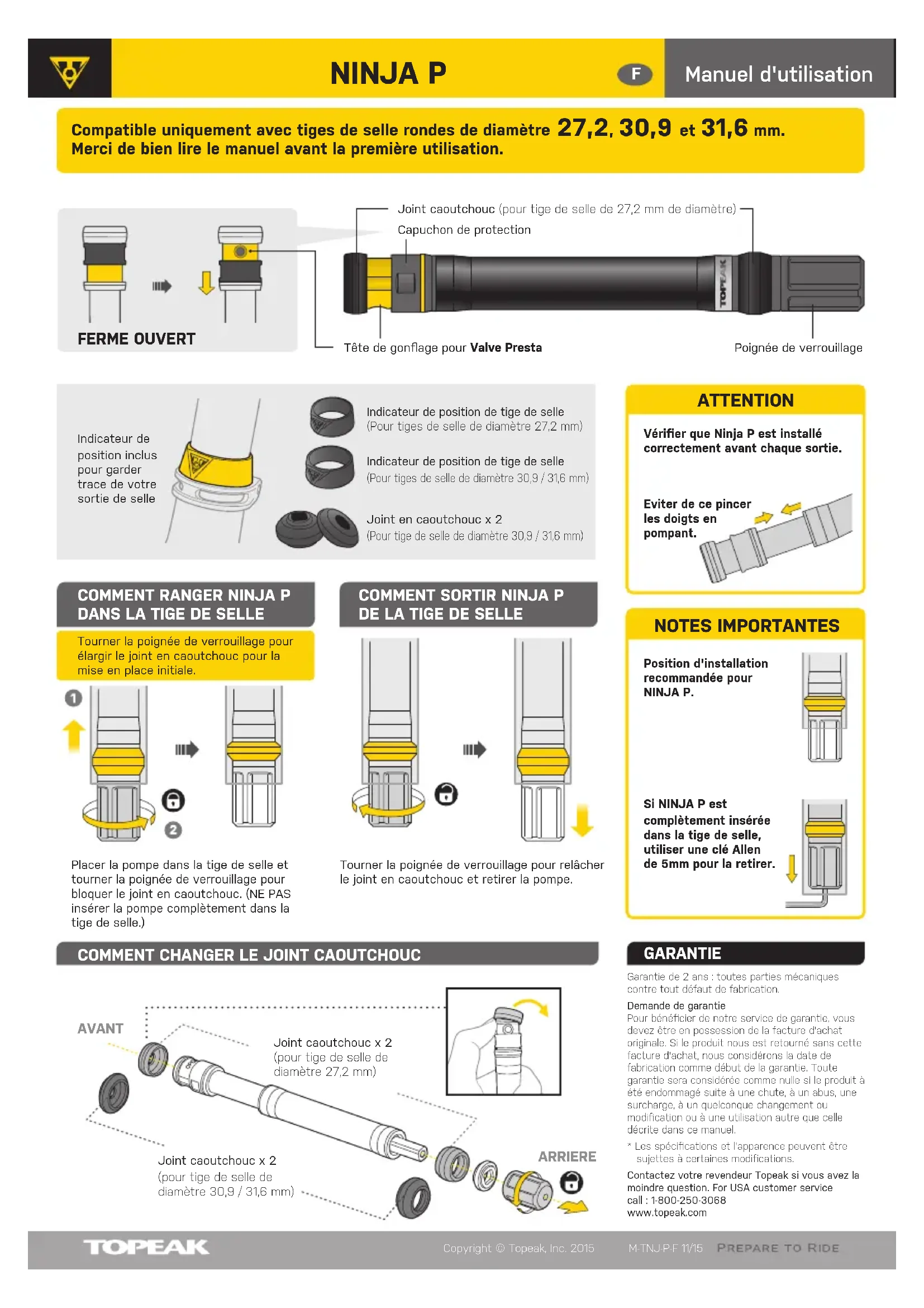 Tête de gonflage pour Valve Presta Capuchon de protectionGarantie de 2 ans : toutes parties mécaniques contre tout défaut de fabrication.Demande de garantiePour bénéficier de notre service de garantie, vous devez être en possession de la facture d'achat originale. Si le produit nous est retourné sans cette facture d'achat, nous considérons la date de fabrication comme début de la garantie. Toute garantie sera considérée comme nulle si le produit à été endommagé suite à une chute, à un abus, une surcharge, à un quelconque changement ou modification ou à une utilisation autre que celle décrite dans ce manuel. * Les spécifications et l'apparence peuvent être sujettes à certaines modifications.Contactez votre revendeur Topeak si vous avez la moindre question. For USA customer service call : 1-800-250-3068www.topeak.com GARANTIE Compatible uniquement avec tiges de selle rondes de diamètre 27,2, 30,9 et 31,6 mm. Merci de bien lire le manuel avant la première utilisation. Joint caoutchouc (pour tige de selle de 27,2 mm de diamètre)Poignée de verrouillageCopyright © Topeak, Inc. 2015 M-TNJ-P-F 11/15 FERME OUVERT AVANTARRIEREJoint caoutchouc x 2(pour tige de selle de diamètre 27,2 mm)Joint caoutchouc x 2(pour tige de selle de diamètre 30,9 / 31,6 mm)Tourner la poignée de verrouillage pour élargir le joint en caoutchouc pour la mise en place initiale.Indicateur de position inclus pour garder trace de votre sortie de selle Placer la pompe dans la tige de selle et tourner la poignée de verrouillage pour bloquer le joint en caoutchouc. (NE PAS insérer la pompe complètement dans la tige de selle.)Tourner la poignée de verrouillage pour relâcher le joint en caoutchouc et retirer la pompe.Position d'installation recommandée pour NINJA P.Si NINJA P est complètement insérée dans la tige de selle, utiliser une clé Allen de 5mm pour la retirer.Vérifier que Ninja P est installé correctement avant chaque sortie. ATTENTION Eviter de ce pincer les doigts en pompant. NOTES IMPORTANTES