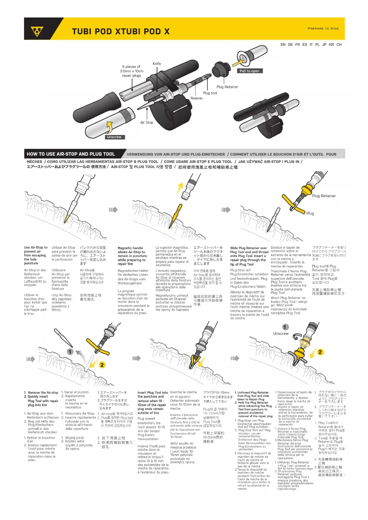 while extracting the Plug Tool from puncture to prevent accidental removal of the repair plug 1. Plug-Stop von Plug- Einstecher abschrauben und auf Plug schieben2. Plug-Stop fest auf Plug drücken, um ein versehentliches Entfernen des Plugs beim Herausziehen des Plug-Einstechers zu vermeiden1. Dévissez le dispositif de maintien de mèche de l'outil de mèche et faites-le glisser vers le bas de la mèche2.Tenez le dispositif de maintien de mèche pendant l'extraction de l'outil de mèche de la crevaison pour éviter le retrait accidentel de la mèche