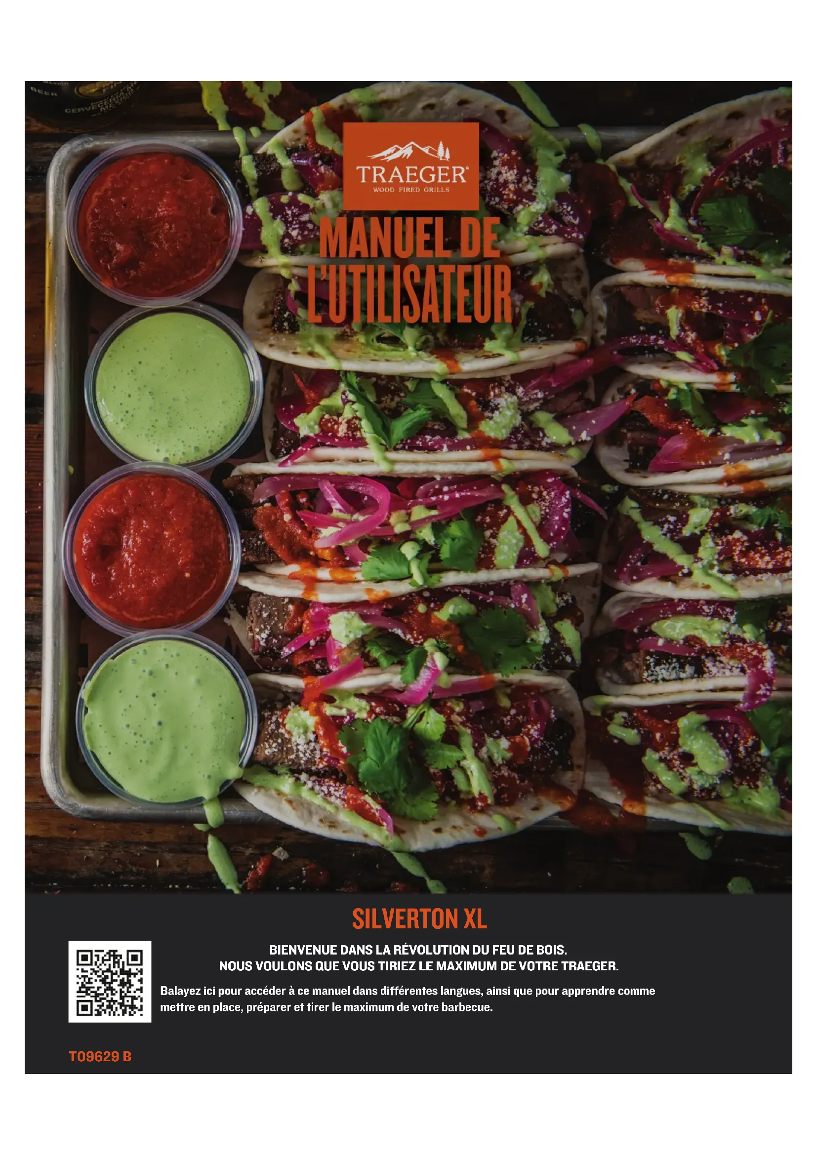 1TRAEGER.COM MANUEL DE L’UTILISATEUR T09629 B SILVERTON XL BIENVENUE DANS LA RÉVOLUTION DU FEU DE BOIS. NOUS VOULONS QUE VOUS TIRIEZ LE MAXIMUM DE VOTRE TRAEGER. Balayez ici pour accéder à ce manuel dans diérentes langues, ainsi que pour apprendre comme mettre en place, préparer et tirer le maximum de votre barbecue.2 L’UNE DES PRINCIPALES CAUSE D’INCENDIE EST L’OMISSION DE MAINTENIR LES AUTORISATIONS REQUISES (CIRCULATION D’AIR) ENTRE LES MATÉRIAUX COMBUSTIBLES ET VOTRE BARBECUE. IL EST EXTRÊMEMENT IMPORTANT QUE CE PRODUIT SOIT INSTALLÉ UNIQUEMENT CONFORMÉMENT AUX PRÉSENTES INSTRUCTIONS. Lorsqu’utilisée et entretenue correctement, la cuisson sur le feu de bois franc sur un barbecue Traeger