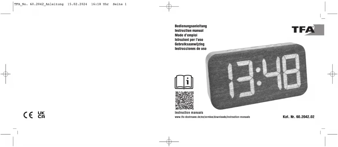 TFA Dostmann GmbH & Co.KG, Zum Ottersberg 12, 97877 Wertheim, Allemagne La reproduction, même partielle, du présent mode d'emploi est strictement interdite sans l'accord explicite de TFA Dostmann. Les caractéristi- ques techniques de ce produit ont été actualisées au moment de l'impression et peuvent être modifiées sans avis préalable. Les dernières don- nées techniques et les informations concernant votre produit peuvent être consultées en entrant le numéro de l'article sur notre site Internet. www.tfa-dostmann.de 02/24 TFA_No. 60.2042_Anleitung 15.02.2024 16:18 Uhr Seite 18– 36 – – 37 – Sveglia digitale