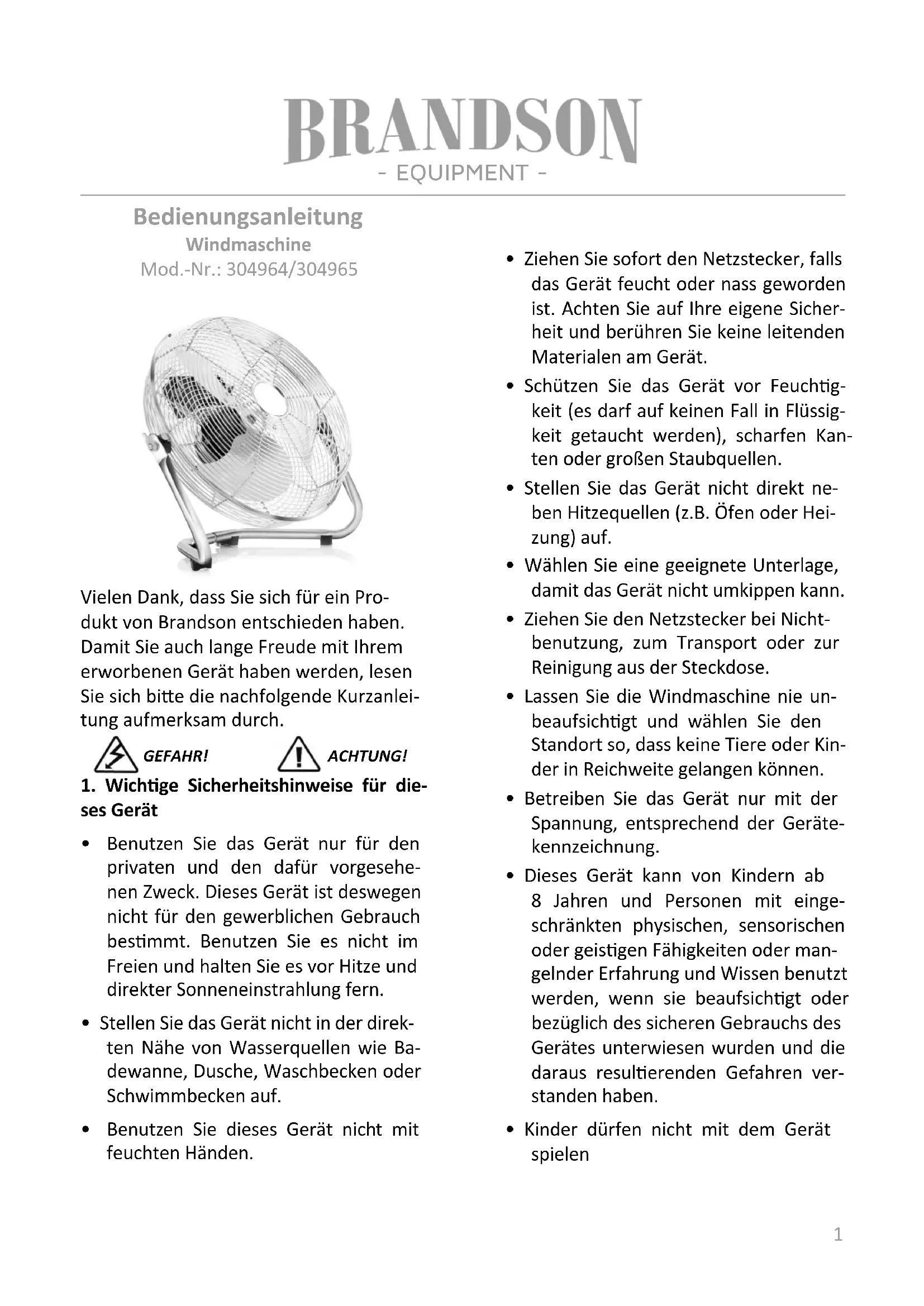 Avec un moteur puissant et des lames de rotor d'env. 50 cm, le venlateur de Brandson assure une venlaon opmale, même durant des journées chaudes. Mode d’emploi - EQUIPMENT -