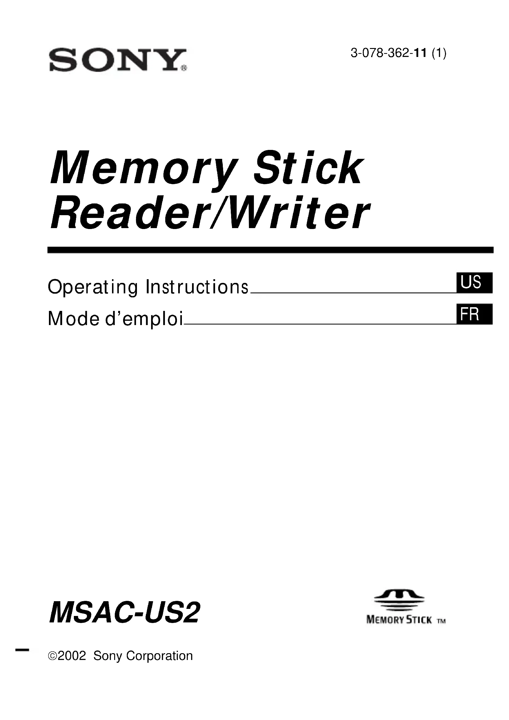 - Other equipment required: a CD-ROM drive. Specifications (continued)Additional Information 35-US2-FR Français Avant la mise en service de cet appareil, prière de lire attentivement ce mode d’emploi que l’on conservera pour toute référence future. Pour les clients au Canada Cet appareil numérique de la class B est comforme à la norme NMB-003 du Canada. Cet appareil peut être raccordé à un ordinateur pour transférer les données d’un “Memory Stick” rapidement sur un ordinateur. Le “Memory Stick” pourra aussi être utilisé comme disque amovible. Ce manuel indique comment raccorder cet appareil, comment installer le pilote et commet utiliser le service clientèle. Précautions Lors de l’utilisation de cet appareil, gardez à l’esprit les mises en garde suivantes :