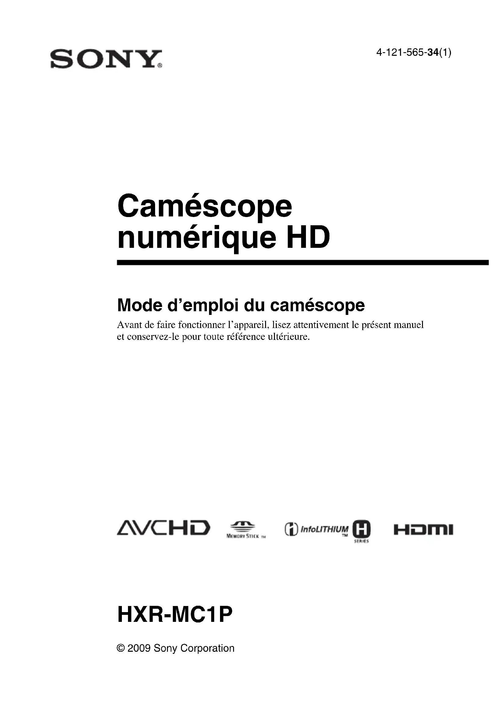 4-121-565-34(1) © 2009 Sony Corporation Caméscope numérique HD Mode d’emploi du caméscope Avant de faire fonctionner l’appareil, lisez attentivement le présent manuel et conservez-le pour toute référence ultérieure. HXR-MC1P2 A lire avant d’utiliser votre caméscope Avant de faire fonctionner l’appareil, lisez attentivement le présent manuel et conservez-le pour toute référence ultérieure. Gestion des images enregistrées sur votre caméscope sur un ordinateur Reportez-vous au « Manuel de PMB (Picture Motion Browser) » sur le CD-ROM fourni. Types de « Memory Stick » compatibles avec le caméscope