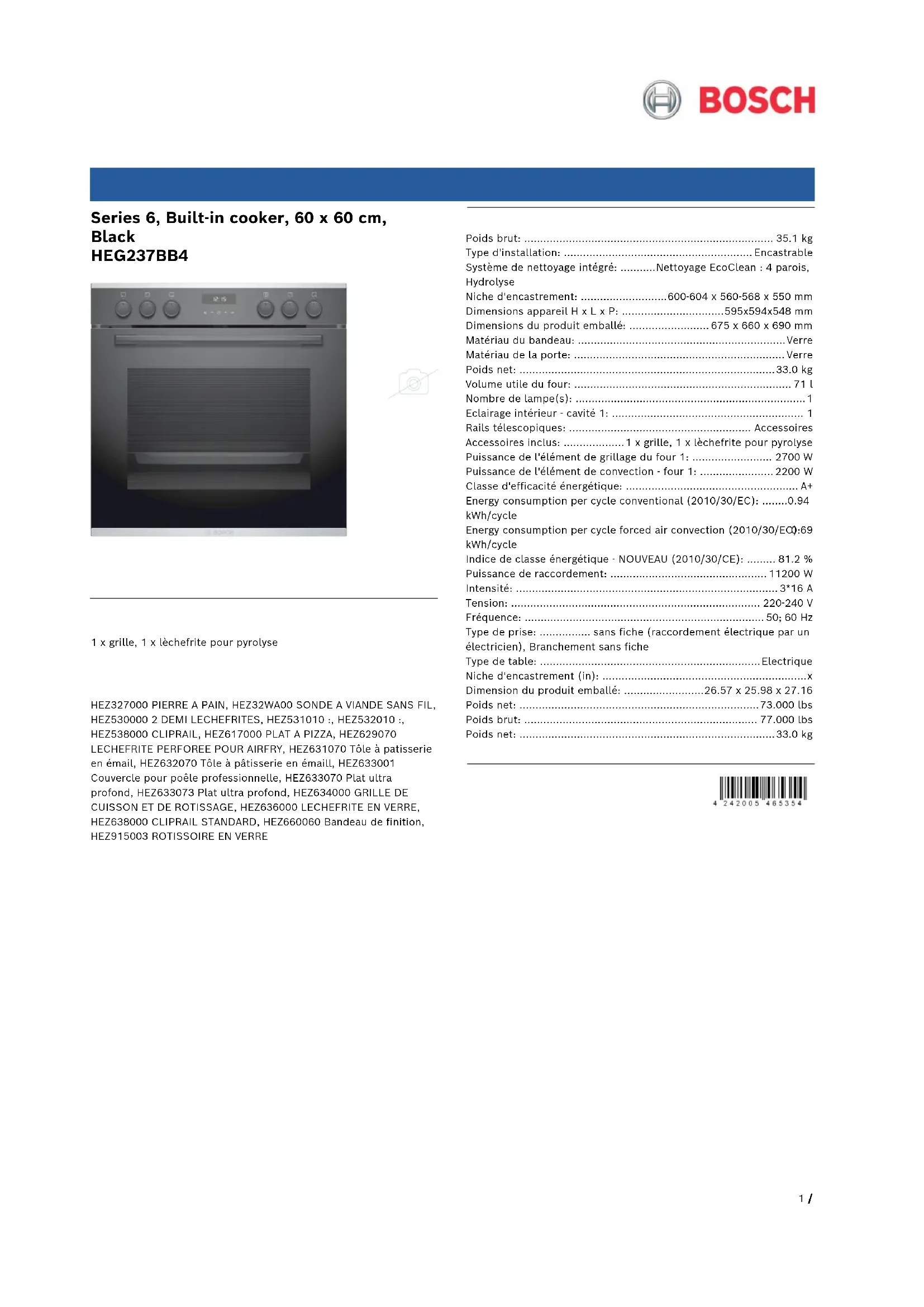 | Caractéristiques techniques | Four encastrable BOSCH HEG237BB4, capacité de 71 litres, classe énergétique A, 7 modes de cuisson. |