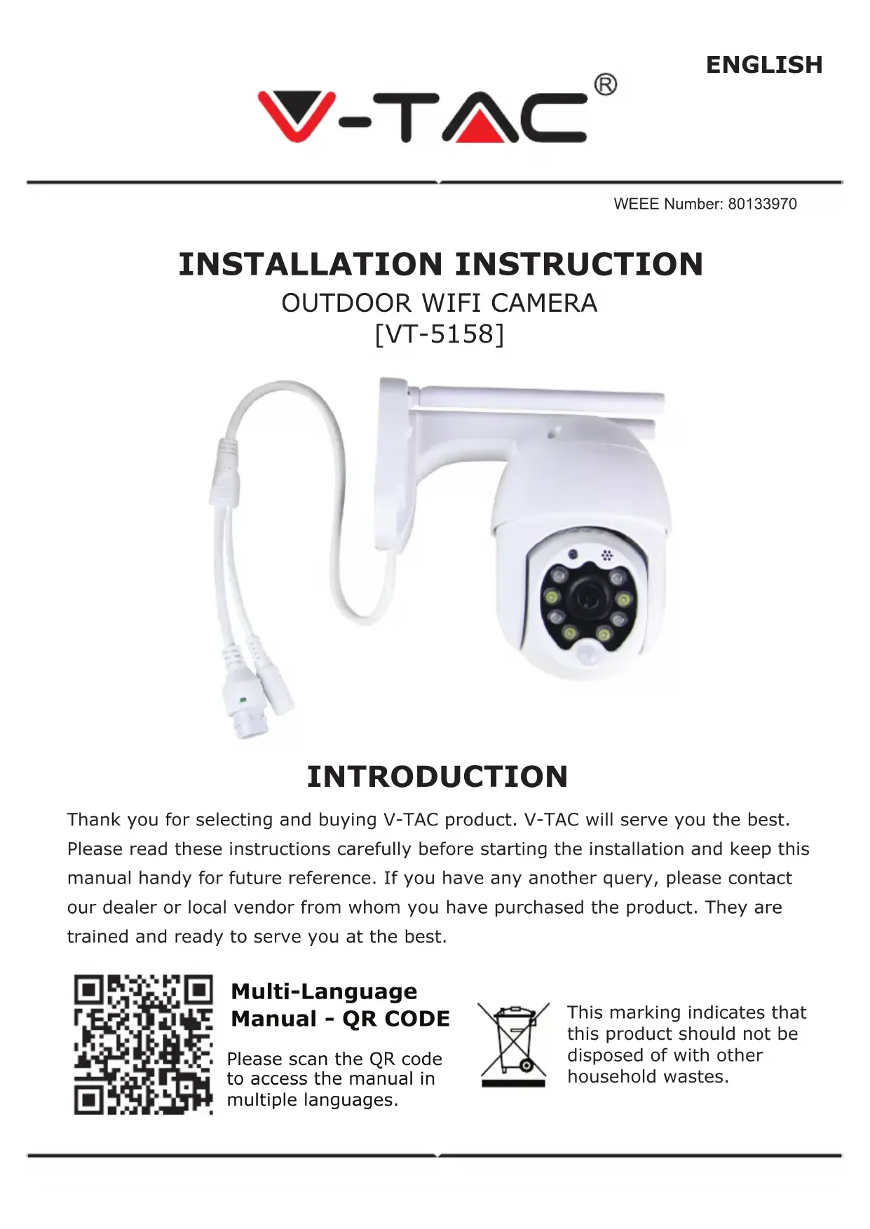 Hay dos maneras: R: Cuando necesite cambiar a otra red Wi-Fi sin cambiar la ubicación: Menú Setting (Configu- raciones) >> Wi-Fi Network (Red Wi-Fi) >> seleccione Wi-Fi. B: Cuando desplaza la cámara a otra ubicación, actívela; en la página principal verá "Device disconnected (Dispositivo desconectado)" - haga clic en "TROUBLESHOOT (SOLUCIÓN DE PROBLEMAS)" para volver a conectarla a Wi-Fi. SPANISHWEEE Number: 80133970 INSTRUCTION D'INSTALLATION Manuel multilingue - QR CODE Veuillez scanner le code QR pour accéder au manuel en plusieurs langues. INTRODUCTION Merci d’avoir choisi et acheté un produit à V-TAC. V-TAC vous offrira le meilleur. Veuillez lire attentivement ces instructions avant de commencer l’installation et conservez ce manuel à portée de main pour référence ultérieure. Si vous avez d’autres questions, veuillez contacter notre distributeur ou le fournisseur local auprès duquel vous avez acheté le produit. Ils sont formés et prêts à vous server au mieux. Ce marquage indique que ce produit ne doit pas être jeté avec d'autres déchets ménagers.