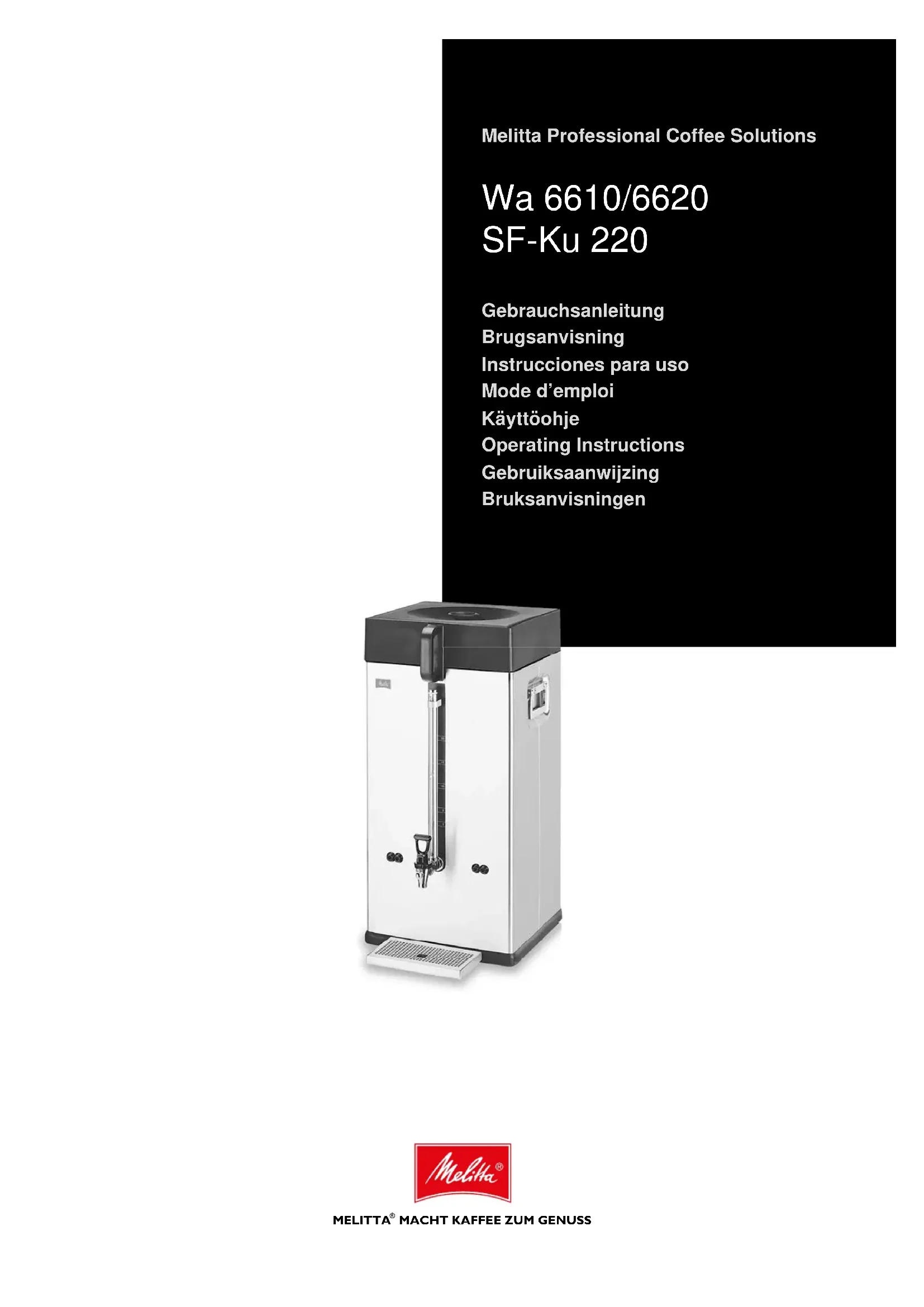 Le support-filtre SF-Ku 220 - pour 1 à 20 litres de café - con- vient aux Wa 6610 et 6620. (Utiliser le filtre papier correspon- dant: Pa 220 G, réf. 1014228).8 Plusieurs essais sont nécessaires afin d’arriver à un équilibrage parfait du dosage de votre café. Préparation du filtre Introduire le papier filtre dans le porte filtre (3) et le remplir de café moulu (ou de thé). Dosage conseillé pour le café: environ 5/7 grammes par tasse ou 35/50 grammes par litre. Dosage conseillé pour le thé: environ 1,5 gramme par tasse ou 5/12 grammes par litre. Placer le porte filtre (3) sur le récipient conservateur (6). Filtration A sperger avec de l’ eau frémissante le milieu du filtre. Continuer ensuite à faire passer de l’eau jusqu`à ce que la quantité de boisson desirée soit atteinte. Ces générateurs automatiques de la série 6600 versent automa- tiquement la bonne quantité d’ eau chaude sur la mouture. Déclenchement de la machine Lorsque le réservoir est vide, ou pendant la nuit, l’appareil doit être débranché. Débrancher la prise (10) et couper l’arrivée de courant. Nettoyage et entretien ATTENTION! Pour son nettoyage, l’appareil ne doit en aucun cas être immergé. Les machines à café professionnelles MELITTA jouissent d’une très bonne réputation qui à pu être démontrée. Leur entretien régulier vous assure pour longtemps l’obtention de la meilleure qualité de café. Pour ce faire, MELITTA met à votre desposition une gamme com- plète de produits d’ entretien. Pour le nettoyage des surfaces extérieures Elles doivent être frottées régulièrement avec un chiffon sec. Pour les récipients conservateurs Diluer 20 à 30 grammes de nettoyant par litre d’ eau. Verser cette solution dans le récipient conservateur et remplir d’ eau chaude. Nettoyer à l’aide d’une brosse appropriée et faire s’écouler cette solution par le robinet de tirage. Rincer ensuite plusieurs fois à l’eau claire. Nettoyage du tube de niveau Ôter la protection en verre et nettoyer le tube de niveau (7) à l’aide du goupillon fourni avec la machine
