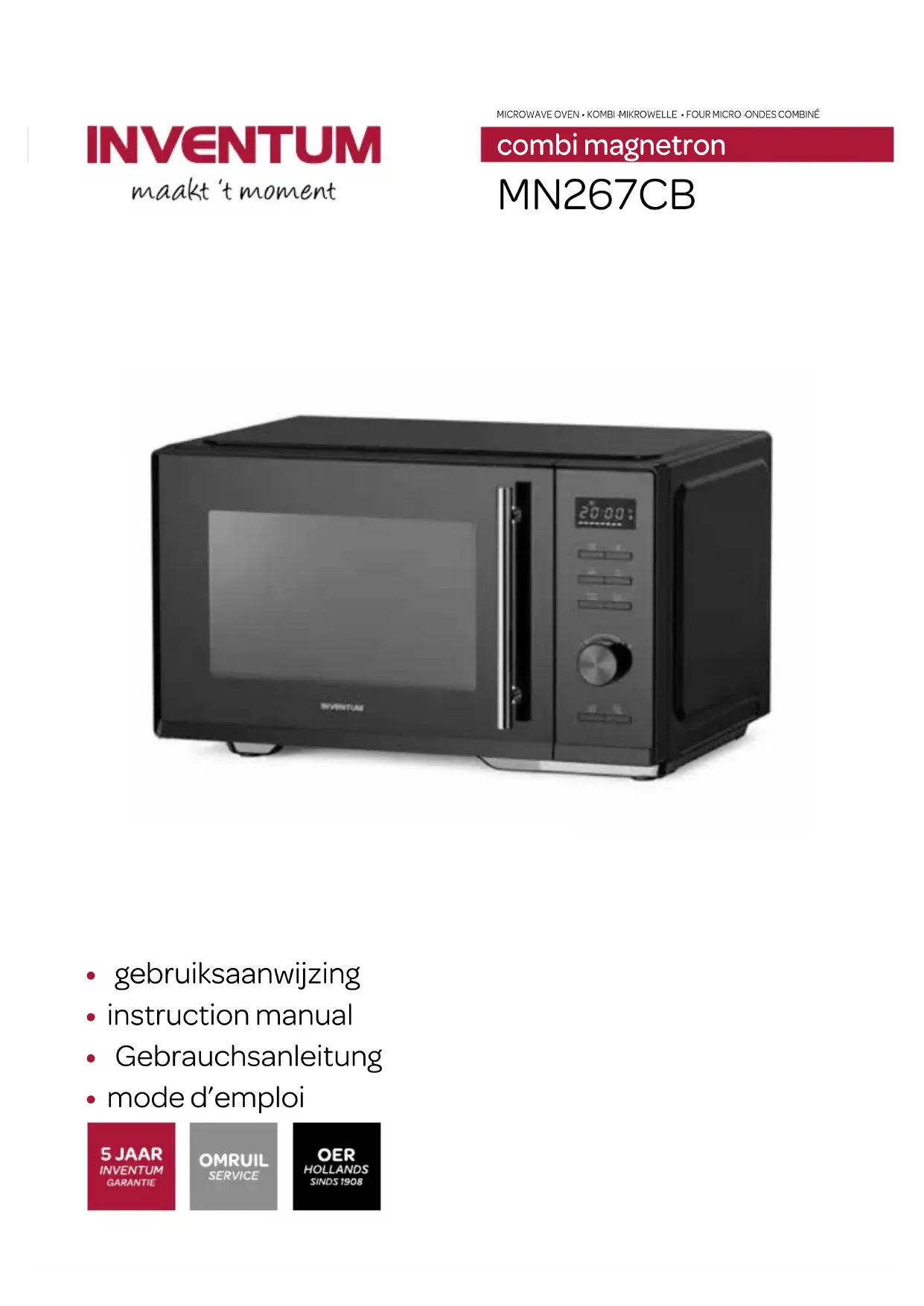 Avant de nettoyer le four micro-ondes combiné, éteignez l’appareil, débranchez la fiche de la prise de courant murale et laissez-le entièrement refroidir. Intérieur Nettoyez l’intérieur de l’appareil après chaque utilisation. Utilisez un chiffon humide. Pour un nettoyage en profondeur, utilisez de l’eau chaude et un produit vaisselle, et séchez bien l’intérieur avec un chiffon. Accessoires Nettoyez les accessoires comme le plateau tournant, l’anneau pour le plateau tournant et la grille à l’eau chaude et un produit vaisselle. Ces accessoires ne peuvent pas être lavés au lave-vaisselle. Séchez-les bien avant de les réutiliser. Extérieur Nettoyez l’extérieur de l’appareil avec un chiffon humide ou une éponge. Si nécessaire, nettoyez l’extérieur de l’appareil à l’aide d’un produit vaisselle doux. Nettoyez également méticuleusement la porte et le caoutchouc de porte.algemene service- en garantievoorwaarden Op dit product wordt een garantie van 5 jaar verleend. Uw garantie is geldig wanneer het product is gebruikt in overeenstemming met de gebruiksaanwijzing en voor het doel waarvoor het gemaakt is. Tevens dient het originele aankoopbewijs overlegd te worden met daarop de aankoopdatum, de naam van de retailer en het artikelnummer van hetproduct. Voor uitgebreide garantievoorwaarden verwijzen wij u naar onze website: www.inventum.eu/service/garantie-informatie A 5 year warranty is provided for this product. Your warranty is valid if the product has been used in accordance with the user instructions and for the purpose for which it was made. Also the original proof of purchase must be submitted, stating the date of purchase, the name of the retailer and the item number of the product. For extensive warranty information you are referred to our website: www.inventum.eu/service/garantie-informatie Für dieses Produkt gewähren wir eine Garantie von 5 Jahre. Diese Garantie gilt jedoch nur, wenn das Produkt in Übereinstimmung mit den Anweisungen in der Gebrauchsanleitung und für den Zweck, für den es hergestellt wurde, verwendet wird. Darüber hinaus muss der originale Kaufbeleg (mit Kaufdatum, Namen des Einzelhändlers und Artikelnummer des Produkts) vorgelegt werden. Die ausführlichen Garantiebestimmungen finden Sie auf unserer Webseite: www.inventum.eu/service/garantie-informatie Ce produit est garanti pour une période de 5 ans. Votre garantie est valable lorsque le produit est utilisé conformément au mode d'emploi et pour l'usage auquel il est destiné. Par ailleurs, la preuve d'achat originale doit être fournie, en portant mention de la date d'achat, du nom du détaillant ainsi que du numéro d'article du produit. Pour connaître les conditions de garantie détaillées, rendez-vous sur notre site Internet: www.inventum.eu/service/garantie-informatie general terms and conditions of service and warranty Allgemeine Service- und Garantiebedingungen conditions générales de garantie et de service après-vente
