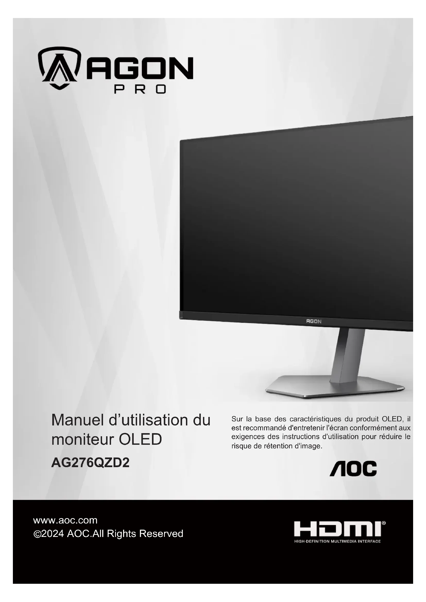 AGON Pro AG276QZD2 - Moniteur AOC - Notice d'utilisation et mode d'emploi gratuit