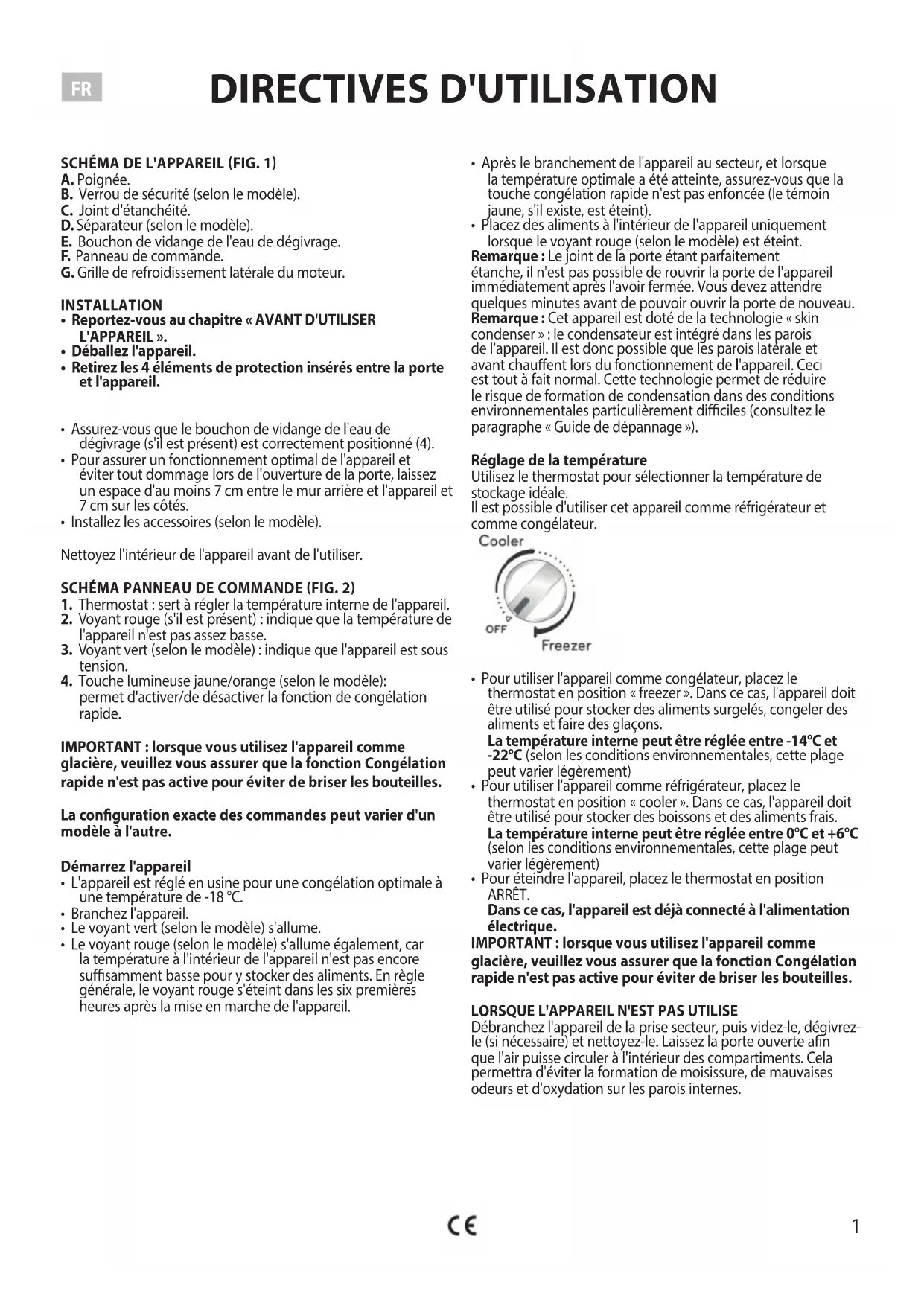 - Pour éteindre l'appareil, placez le thermostat en position ARRÊT. Dans ce cas, l'appareil est déjà connecté à l'alimentation électrique. IMPORTANT: lorsque vous utilisez l'appareil comme glacière, veuillez vous assurer que la fonction Congélation rapide n'est pas active pour éviter de briser les bouteilles.