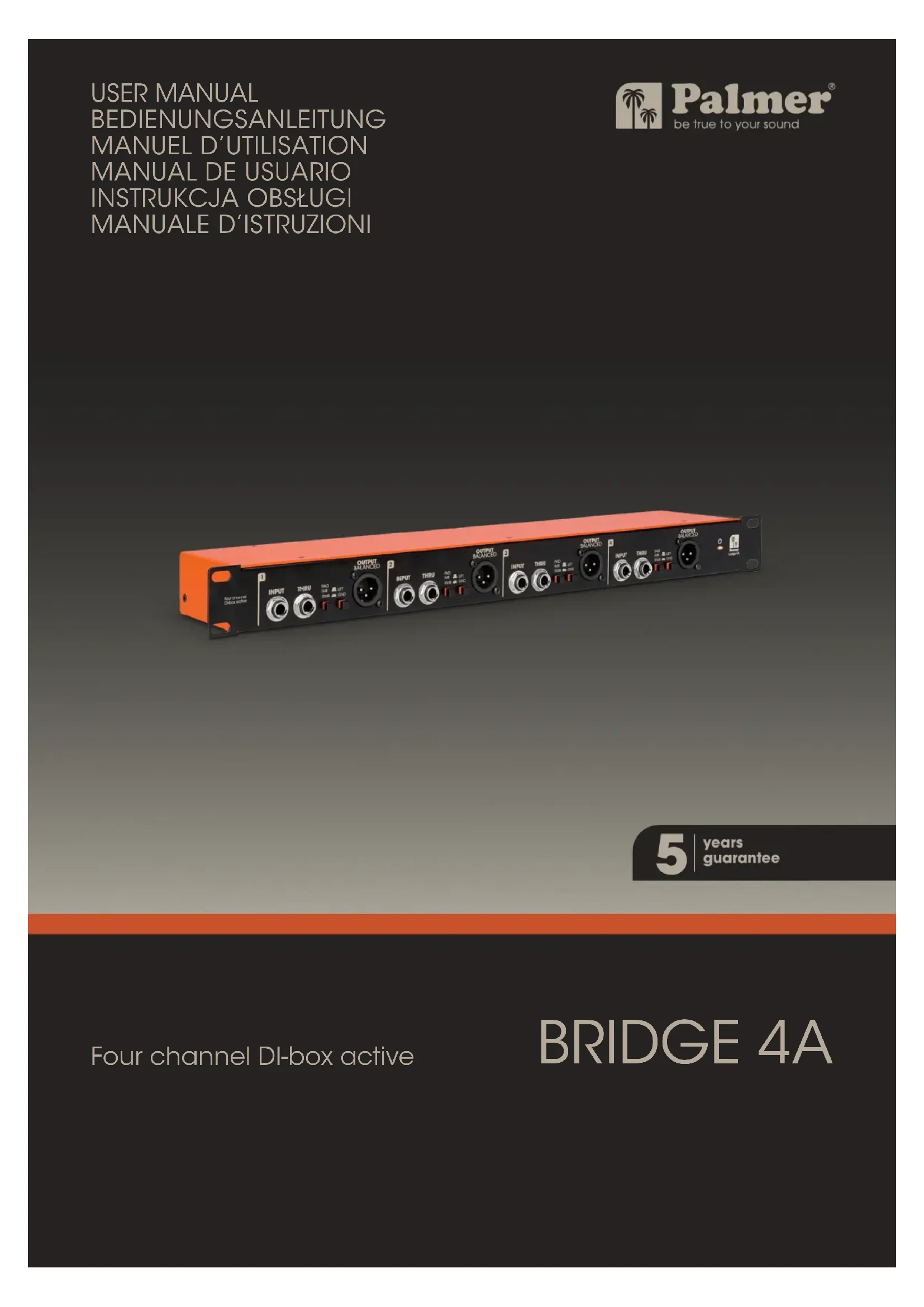 Retirez le produit de son emballage, et mettez de côté tous les matériaux d’emballage. Assurez-vous que la livraison est complète et n'est pas endommagée; dans le cas contraire, informez votre partenaire commercial aussitôt après l’achat. Contenu du carton: ▶ 1 boîte de direct active à quatre canaux BRIDGE 4A ▶ 1 bloc secteur ▶ Fiche produit INTRODUCTION Le Palmer BRIDGE 4A dispose de 4 canaux indépendants, techniquement identiques. C'est un outil profession- nel pour le studio et la scène, permettant de convertir un signal audio asymétrique en un signal audio symé- trique sans altération. Le transformateur audio interne offre une gamme dynamique exceptionnelle et une excellente résistance à la saturation. Une boîte de direct sert à connecter des instruments à cordes équipés de micros ou capteurs (guitares acoustiques, guitares/basses électriques), des instruments à sortie au niveau ligne (claviers électroniques) et des sorties au niveau haut-parleur d'amplificateurs de guitare aux entrées symétriques d'une console de mixage ou d'une interface audio. Une boîte de direct permet également de transporter des signaux audio sur de longues distances sans parasites ni ronflette.