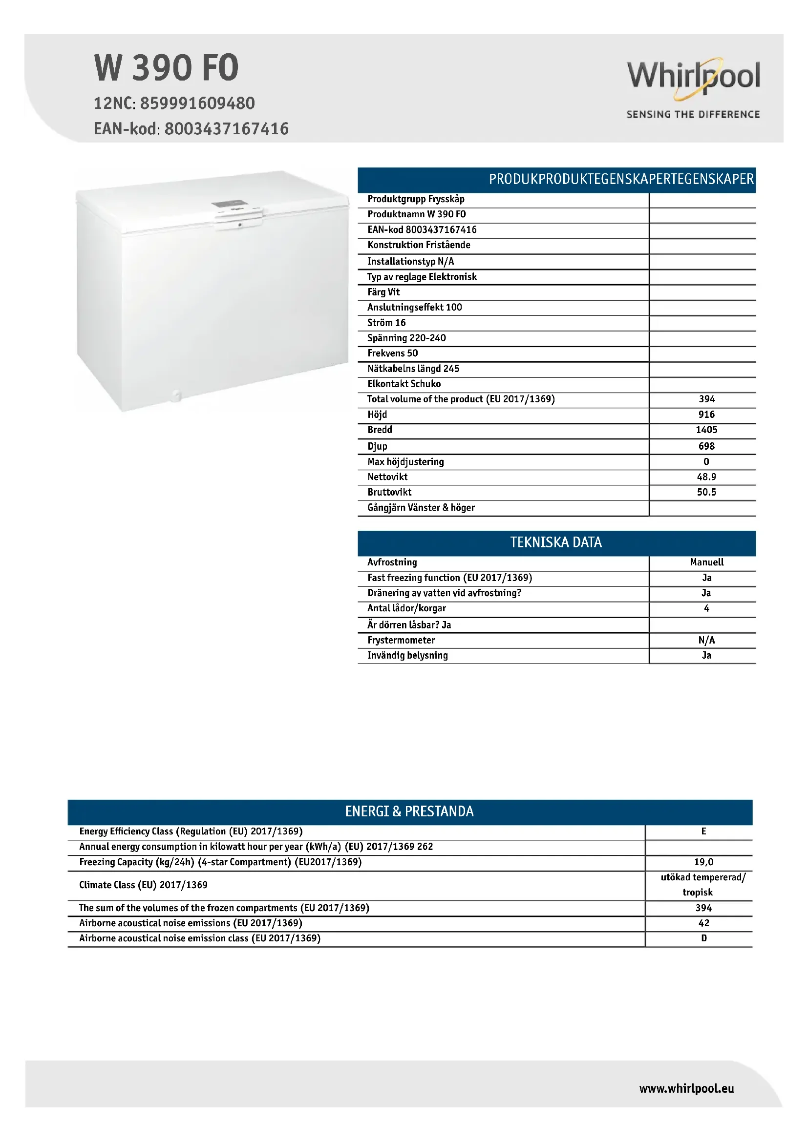 W 390 FO - Congélateur WHIRLPOOL - Notice d'utilisation et mode d'emploi gratuit