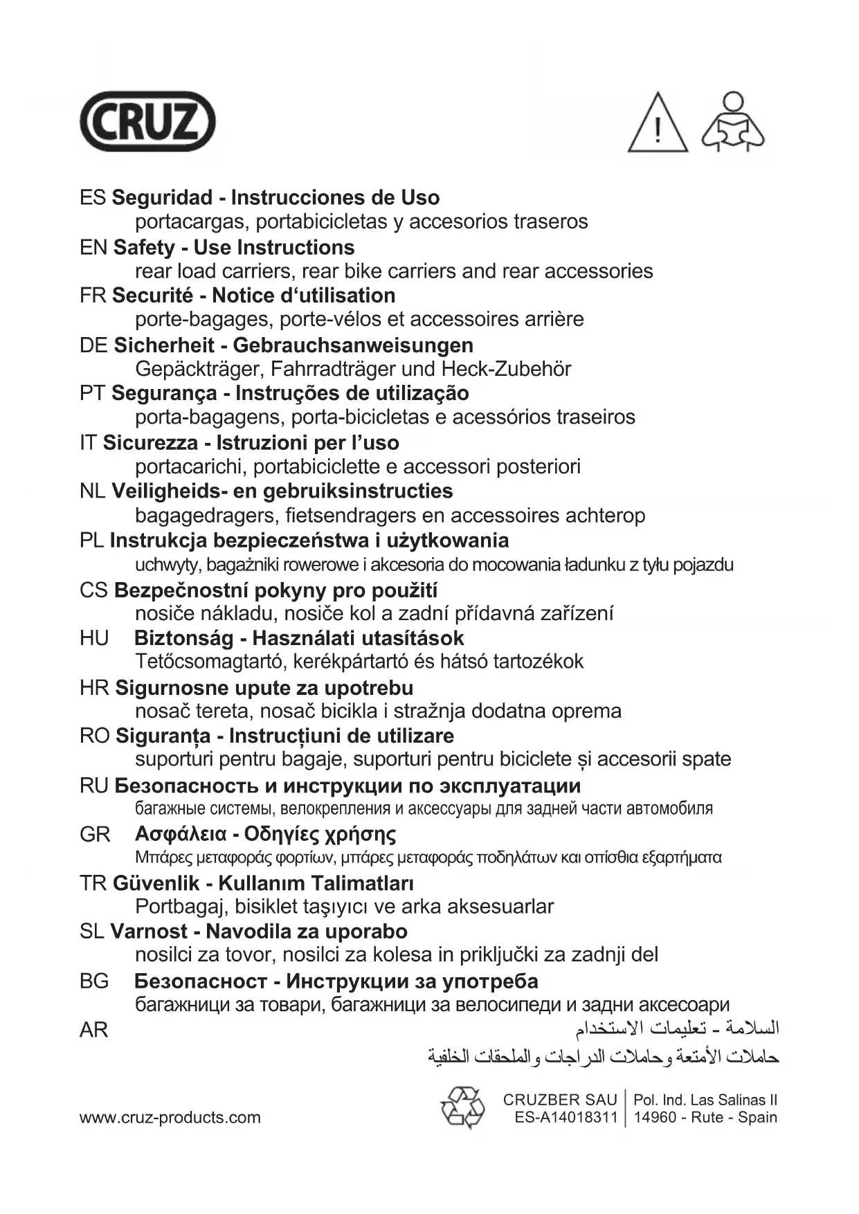 dommage ne soit causé au véhicule et/ou au chargement après un montage et une utilisation appropriés. FR Securité - Notice d’utilisation porte-bagages, porte-vélos et accessoires arrière IMPORTANT! Ce notice de securité - utilisation complète les instructions d’assemblage, fournies avec chaque produit dans son emballage. 10 CRUZ safety - use instructions - rear load carriers and accessories - lv9-V24R014. Le conducteur est seul responsable de s’assurer que le porte-bagages, le porte-vélos ou tout accessoire arrière et le chargement sont correctement xés (en respectant toujours les con- signes de sécurité – utilisation et montage) même s’ils sont montés par une tierce personne.