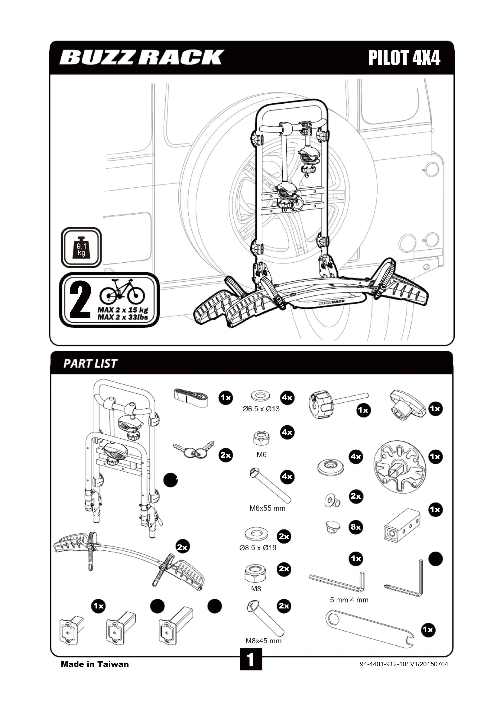 2006~2010 ISUZU Amigo 1999~2001 Mu Wizard 1995~1998 Rodeo 1991~2004 Trooper 1992~2002 JEEP CJ-7 1979~1995 Liberty 2002~2007 Liberty Renegade 2005~2007 Wrangler 1987~2015 Wrangler Unlimlted 2004~2015 KIA Sportage 1995~2002 LAND ROVER Defender 1993~1997 Discovery 1994~2004 Discovery Series II 2000~2002 Freelander 2002~2005 MITSUBISHI Montero 1990~2006 Montero Sport 1997~2004 Pajero 1982~2015 NISSAN Pathfinder 1996~2001 Patrol/Safari 1980~2009 Terrano II 1993~2006 OPEL Frontera 1992~2004 Monterey 1991~1999 SUZUKI Escudo 1988~2015 Jimny 1981~2015 Sidekick 2DR 1991~1998 Sidekick 4DR 1991~1998 Vitara 1998~2014 XL-7 1998~2006 TOYOTA CAMI 1997~2005 FJ Cruiser 2007~2015 Land Cruiser 1984~1998 RAV 4 1996~2012 Rush 2006~2015GENERAL REMARKS 01.Please read and observe the instructions carefully before you use the product, and keep them in a safe place for future use. Check the part list after opening the package. Make sure that all the parts are fully assembled according to the instruction before tting it on your car. 02.The user is responsible for assembly and installation of this product, and the manufacturer disclaims any liability due to improper tting or use of the product. 03.Failure to properly install this bike carrier and/or the bikes may cause damage to the vehicle and/or the bikes, and may result in personal injury. 04.Do not use this product for purposes other than those for which it is designed. Do not modify any components of the product. Remove the carrier if not in use. 05.Do not use the carrier to carry more bikes than recommended. The weight of each bike cannot exceed 15kg/ 33lbs. 06.Do not install the bike carrier on trailers, campers, or RVs. 07.This bike rack is not intended for transporting tandem, or recumbent bicycles. 08.Do not transport bicycles with attached baby seats, panniers, wheel covers, full bike covers or motors. 09.For BEETLE 4x4 / PILOT 4X4, make sure that the spare tire cover or tail lights of your car allows you to use this product. If you have any questions, please consult the store where you made the purchase. 01.Lire attentivement les instructions et les conserver pour une utilisation ultérieure. Vérier la liste des pièces à l'ouverture de la boîte. S'assurer que le produit est assemblé selon les instructions avant de le monter sur le véhicule. 02.L’utilisateur est entièrement responsable de l’assemblage, de l’installation et de l’utilisation du produit. Le fabricant et le distributeur ne pourront être tenus responsables de réclamations suite à une utilisation inadéquate du produit. 03.Une mauvaise installation du produit ou des vélos peut entrainer des dommages matériels au véhicule ainsi qu'aux vélos et dans le pire cas des dommages corporels. 04.Ne pas utiliser le produit à d'autres ns que celles pour lesquelles il a été conçu. Ne pas modier de composants du produit. Retirer le produit lorsque vous ne l'utilisez pas. 05.Ne pas transporter plus de vélos que la quantité recommandée (maximum de 15 kg/33 lb par vélo) sur le porte-vélo. 06.Ne pas installer ce produit sur une remorque, une auto-caravane (camping-car) ou une maison mobile. 07.Le porte vélos n’est pas prévu pour le transport de tandems, ou vélos à position allongée. 08.Ne pas transporter de bicyclettes munies d’un siège de bébé, de sacoches, de housses de roues, d’une housse de vélo complète ou d’un moteur. 09.Pour BEETLE 4x4 / PILOT 4X4, s'assurer que le couvercle de la roue de secours ou le feu de stop extérieur ne vous empêcheront pas d'installer le porte-vélos. Si vous avez des questions, veuillez demander conseil au revendeur du produit. 01.Nettoyer et dégraisser la boule d'attelage avant d'installer le produit 02.Toujours utiliser les sangles de sécurité fournies pour attacher les vélos au porte-vélo. 03.S'assurer que le hayon ou le core du véhicule permettent d'installer le porte-vélos. Certains éléments comme un déecteur peuvent en empêcher le montage. 04.Vérier la proximité entre la sortie de l'échappement et les pneus des vélos ou les sangles d'attache. La chaleur du pot d'échappement pourrait endommager les vélos ou le porte-vélos. 05.S'assurer que l'essuie-glace arrière n'entre pas en contact avec le porte-vélos ou les vélos. Si tel est le cas et qu'il est automatique, il faut le désactiver avant d'utiliser le porte-vélos. 06.Si votre véhicule est équipé d'une ouverture automatique du hayon, désactiver le système et ouvrir le hayon manuellement. 07.Avant l'utilisation, retirer des vélos tous les éléments qui pourraient se détacher (pompe, sacoches, outils, etc) ainsi que les sièges à bébé. 08.Toujours positionner le vélo le plus lourd ou le plus gros dans la première position (celle proche du véhicule). 09.L'utilisateur a la responsabilité de vérier périodiquement que tous les éléments de serrage ou de montage sont bien serrés pour une sécurité optimale. 10.Il est possible que vous soyez obligés d'utiliser des éléments supplémentaires pour empêcher les vélos de s'endommager ou d'endommager le hayon de véhicule. Retirer la batterie du vélo électrique quand celui-ci est sur le porte-vélo. 11.Ne pas ouvrir le core lorsque les porte-vélos sont installés sur le porte-vélos. 12.Les serrures ont une fonction de dissuasion du vol. 01.Si les vélos ou les porte-vélos cachent les feux arrière ou la plaque d'immatriculation, vous devez utiliser un système secondaire de signalisation. 02.Le porte vélos augmente la longueur du véhicule et les vélos peuvent modier la largeur et la hauteur véhicule. Attention en cas de passage étroit et délicat ou en cas de marche arrière. Les charges débordantes du dispositif de portage doivent remplir les prescriptions de la réglementation en vigueur et être convenablement sanglées. 03.Le chargement modie les conditions de conduite et de manoeuvrabilité. Toujours respecter les limites de vitesse sans jamais dépasser 120 km/h (75 mph) si 