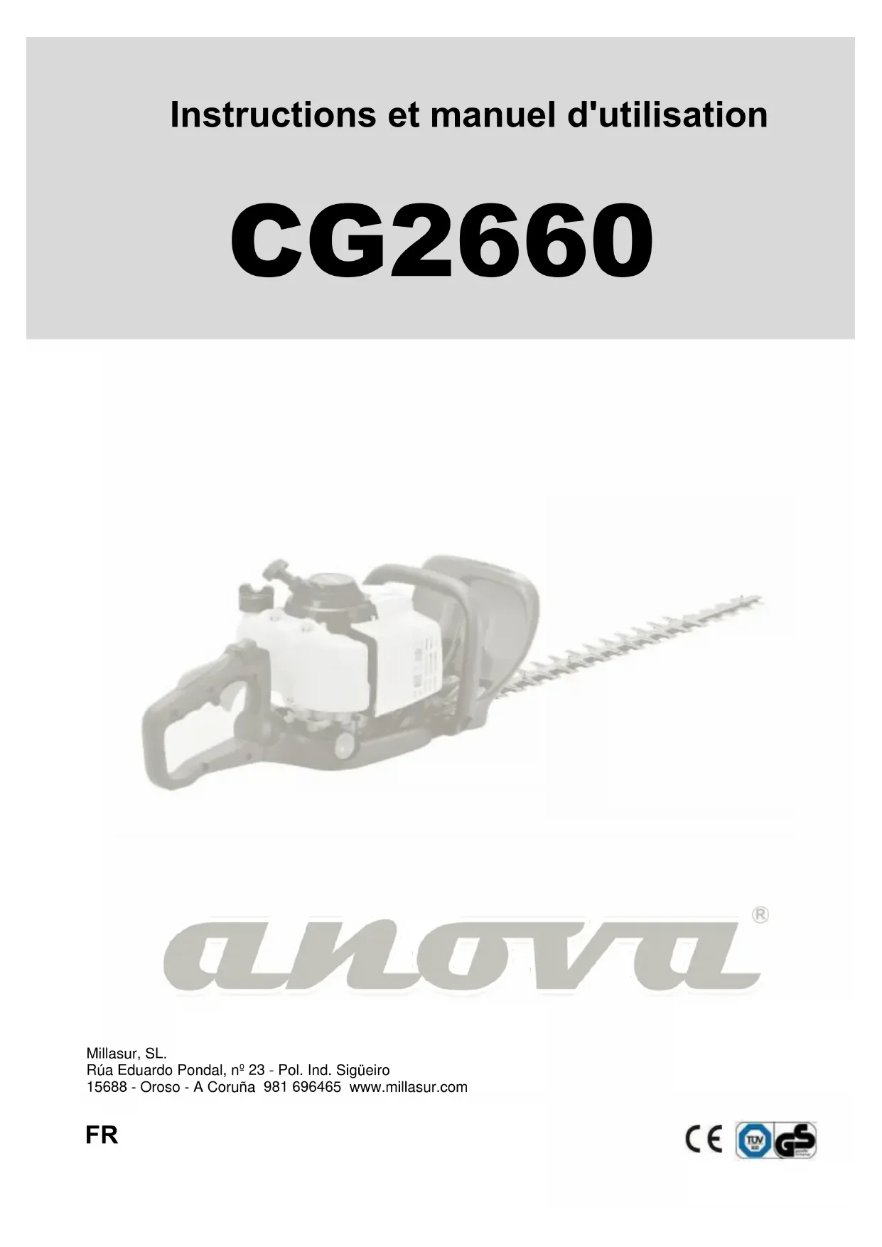 Instructions et manuel d'utilisation CG2660 Millasur, SL. Rúa Eduardo Pondal, nº 23 - Pol. Ind. Sigüeiro 15688 - Oroso - A Coruña 981 696465 www.millasur.com FRANOVA souhaite vous féliciter d'avoir choisi l'un de nos produits et vous garantit l'assistance et la coopération qui ont toujours distingué notre marque au fil du temps. Cette machine est conçue pour durer de nombreuses années et pour être très utile si elle est utilisée conformément aux instructions contenues dans le manuel d'utilisation. Nous vous recommandons donc de lire attentivement ce mode d'emploi et de suivre toutes nos recommandations. Pour plus d'informations ou des questions, vous pouvez nous contacter via nos supports Web tels que www.anovamaquinaria.com.