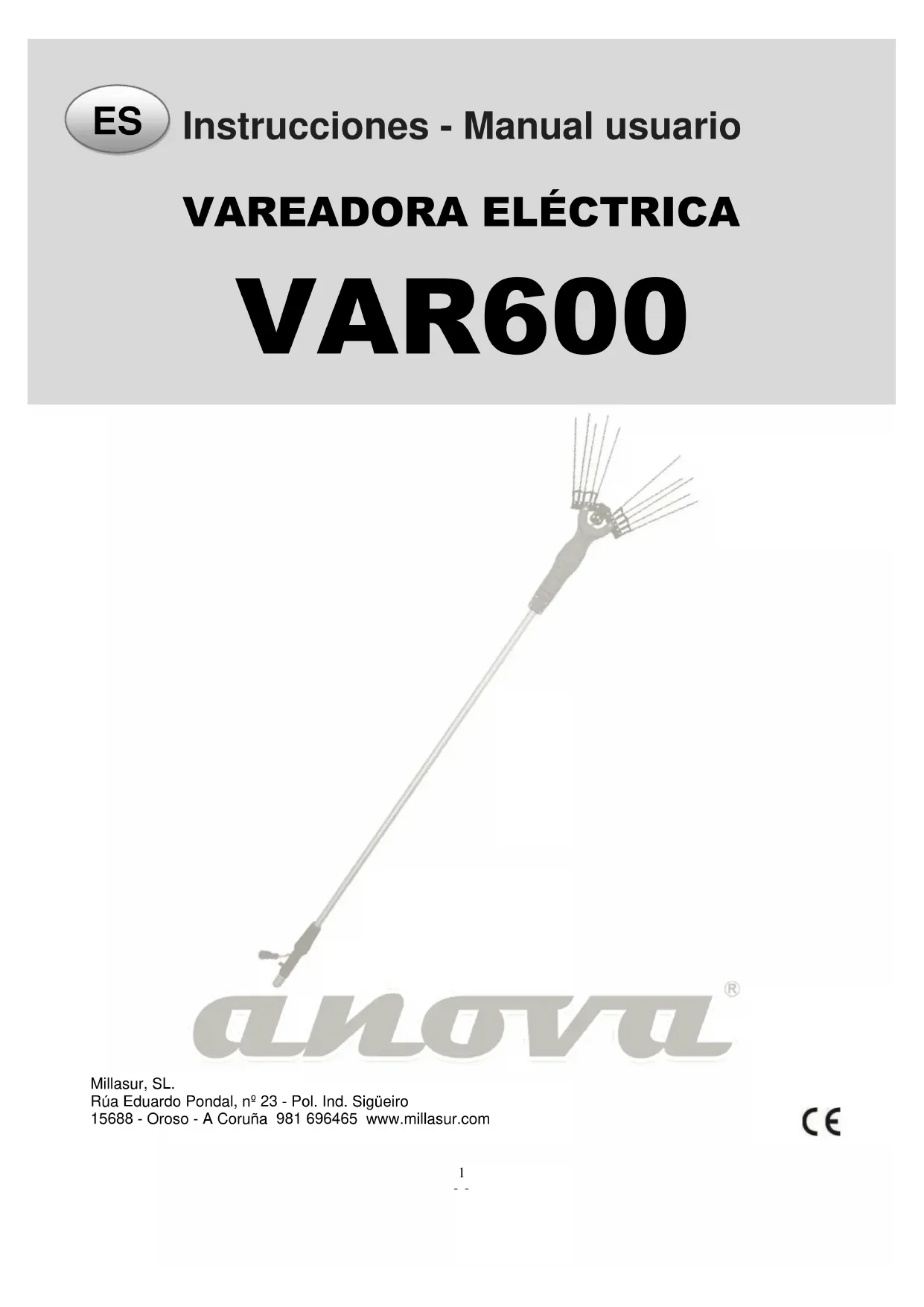 Attention! Lisez tous les avertissements de sécurité et toutes les instructions. Le non-respect de tous les avertissements et instructions indiqués ci-dessous peut entraîner un choc électrique, un incendie et / ou des blessures graves. Utilisez cette laveuse à pression seulement dans l'environnement domestique pour nettoyer des objets tels que des chaises, des tables, des véhicules, des façades, des terrasses, des planchers, etc. N'utilisez pas cette machine pour nettoyer les personnes ou les animaux. N'utilisez pas cette machine pour nettoyer des objets fragiles ou des objets qui ne supportent pas l'eau. Sauvegardez tous les avertissements et toutes les instructions pour une future référence. Si vous vendez cette machine dans le futur, n'oubliez pas de donner ce manuel au nouveau propriétaire. L'expression "machine" dans les avertissements se réfère à cette machine électrique connectée au réseau électrique. Rappelez-vous que l'utilisateur est responsable des accidents et des dommages causés à lui-même, à des tiers et à des choses. Le fabricant ne sera pas responsable des dommages causés par une utilisation incorrecte ou incorrecte de cette machine. VAR600 est une machine de récolte d'olives brevetée avec une haute performance, maniable et léger, qui permet de développer de manière simple et efficace la collection sans l'utilisation d'escaliers. Ce manuel contient toutes les explications nécessaires à l'utilisation correcte de la machine. Il contient également des remarques importantes sur la sécurité, par conséquent, le manuel doit être à proximité de la machine pour une consultation rapide, si nécessaire.