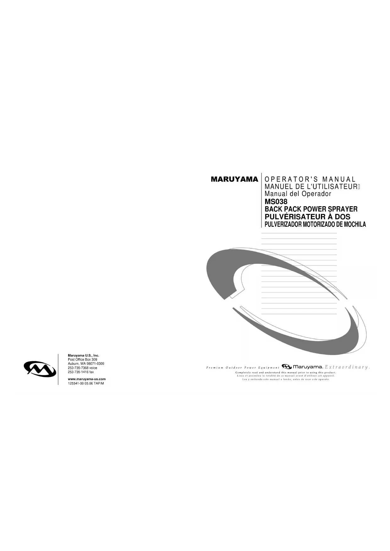 Mixed gasoline (50 : 1) Electronic Ignition CJ8Y Recoil starter Pump Engine Specification may be changed for product improvement, without prior notice. EnglishEnglish2423 Ce symbole accompagné des mots AVERTISSEMENT et DANGER doit attirer votre attention ; il se rapporte à une action ou à une condition pouvant être à l'origine de sérieuses blessures à l'opérateur et aux personnes aux alentours. AVANT PROPOS Ce manuel du propriétaire/utilisateur est conçu afin de familiariser l'opérateur avec les différentes caractéristiques et pièces de l'équipement, et de vous assister pendant le montage, le fonctionnement et la maintenance de votre nouveau PULVÉRISATEUR À DOS. Il est impératif que chaque opérateur de ce PULVÉRISATEUR À DOS lise et comprenne le contenu de ce manuel avant d'utiliser le pulvérisateur. Les instructions de sécurité importantes seront identifiées par le symbole de sécurité suivant : Le non-respect et l'inobservation des instructions incluses dans ce manuel peut être à l'origine de blessures sérieuses, voire mortelles. En cas d'assistance supplémentaires, veuillez contacter le concessionnaire Maruyama le plus proche ou Maruyama U.S., Inc., 301 30th St. NE, Suite 118 Auburn, WA 98002, États-Unis. SYMBOLES DE SÉCURITÉ DE CE MANUEL Tout au long de ce manuel et sur l’appareil lui-même, vous trouverez des messages d'informations utiles et des alertes à la sécurité précédés de symboles ou de mots clé. Ce qui suit correspond à une explication de ces symboles et de ces mots clé ainsi que leur signification.