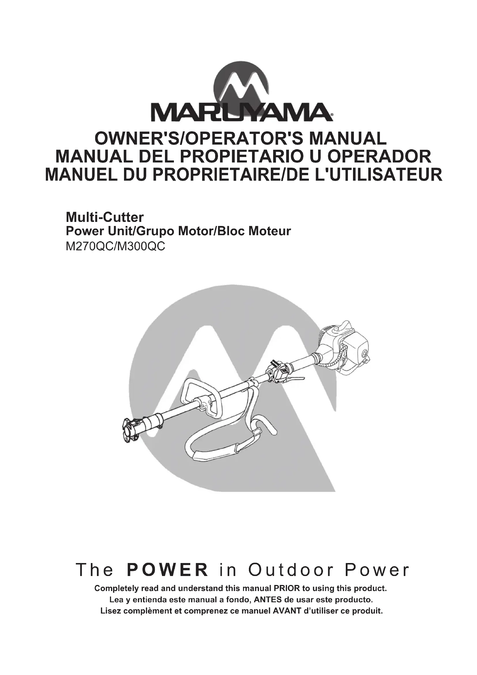 I’essence pour huiler ratio 50:1 Bougie NGK BPM8Y Écartement de bougi (mm) 0.6-0.7 (.024-.028 po.) Homologation EPA et CARB Phase 3, Tier 3 QC-S/QC-ST Accessoire de taille-bordures QC-HT Accessoire de taille-haie QC-HTS /QC-HTR Accessoire de pivotant de taille-haie QC-P/QC-PS/QC-PL Accessoire de l’elagueuse QC-E/QC-ES Accessoire de coupe-bordures QC-T Accessoire de rotoculteur QC-LB Accessoire de lame de paysage QC-LS Accessoire de paysage balayeuse Accessories Pour une installation et l'opération sera soumise le manuel de chaque Accessoire au sein énuméré les Accessoire qui doivent être emballés sur les Multi-Cutter Accessoire.Maruyama U.S., Inc. 4770 Mercantile Drive, suite100, Fort Worth, TX 76137 U.S.A. Phone 940-383-7400 Fax 940-383-7466 www.maruyama-us.com 242109-01 US/ES/FR 20.04 IN