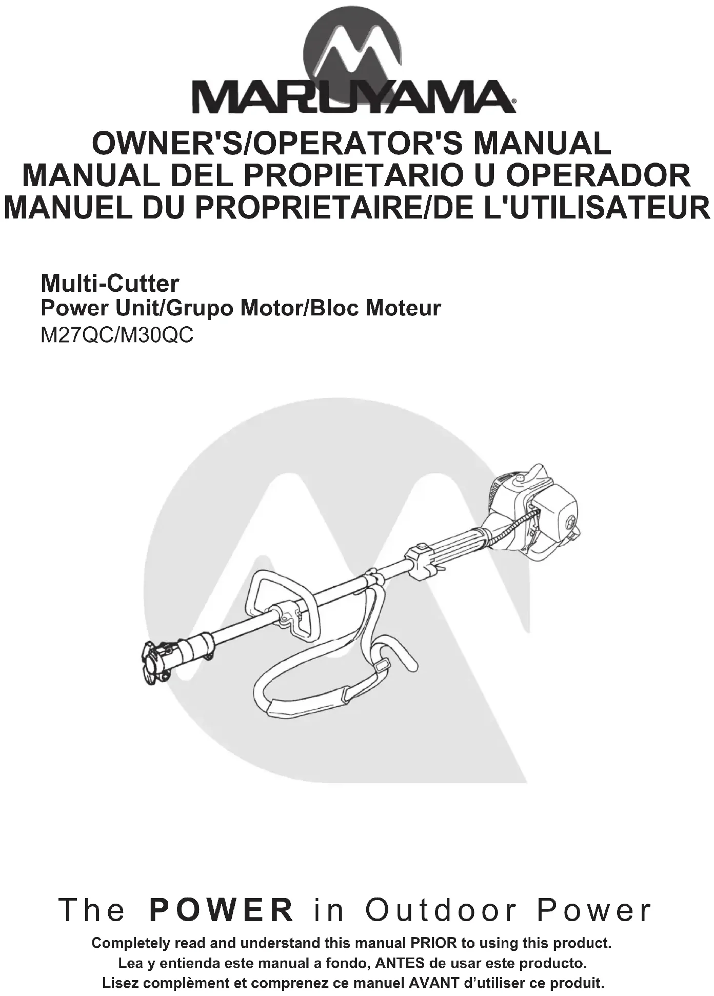 I’essence pour huiler ratio 50:1 Bougie NGK BPM8Y Écartement de bougi (mm) 0.6-0.7 (.024-.028 po.) Homologation EPA et CARB Phase 3, Tier 3 QC-S/QC-ST Accessoire de taille-bordures QC-HT Accessoire de taille-haie QC-HTS /QC-HTR Accessoire de pivotant de taille-haie QC-P/QC-PS/QC-PL Accessoire de l’elagueuse QC-E/QC-ES Accessoire de coupe-bordures QC-T Accessoire de rotoculteur QC-LB Accessoire de lame de paysage QC-LS Accessoire de paysage balayeuse Accessories Pour une installation et l'opération sera soumise le manuel de chaque Accessoire au sein énuméré les Accessoire qui doivent être emballés sur les Multi-Cutter Accessoire.Maruyama U.S., Inc. 4770 Mercantile Drive, suite100, Fort Worth, TX 76137 U.S.A. Phone 940-383-7400 Fax 940-383-7466 www.maruyama-us.com 237775-00 US/ES/FR 15.07 IN