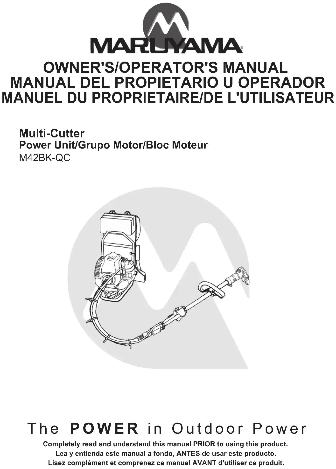 I’essence pour huiler ratio 50:1 Bougie NGK BPM8Y Écartement de bougi (mm) 0.6-0.7 (.024-.028 po.) Homologation EPA et CARB Phase 3, Tier 3 Accessories Pour une installation et l'opération sera soumise le manuel de chaque Accessoire au sein énuméré les Accessoire qui doivent être emballés sur les Multi-Cutter Accessoire. QC-S/QC-ST Accessoire de taille-bordures QC-HT Accessoire de taille-haie QC-HTS /QC-HTR Accessoire de pivotant de taille-haie QC-P/QC-PS/QC-PL Accessoire de l’elagueuse QC-E/QC-ES Accessoire de coupe-bordures QC-T Accessoire de rotoculteur QC-LB Accessoire de lame de paysage QC-LS Accessoire de paysage balayeuseMaruyama U.S., Inc. 4770 Mercantile Drive, suite100, Fort Worth, TX 76137 U.S.A. Phone 940-383-7400 Fax 940-383-7466 www.maruyama-us.com 237790-00 US/ES/FR 15.07 IN
