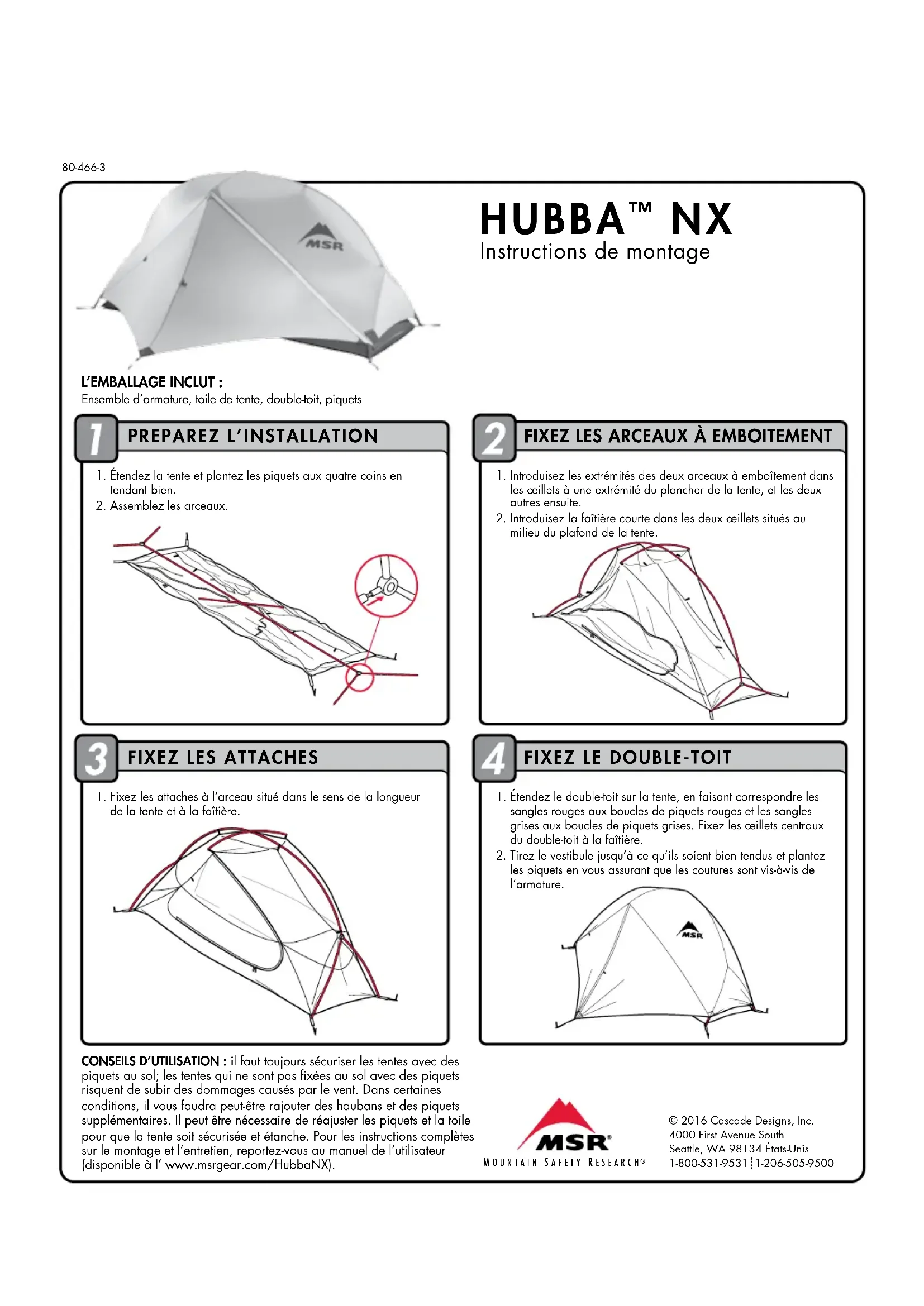 80-466-3 CONSEILS D’UTILISATION: il faut toujours sécuriser les tentes avec des piquets au sol; les tentes qui ne sont pas fixées au sol avec des piquets risquent de subir des dommages causés par le vent. Dans certaines conditions, il vous faudra peut-être rajouter des haubans et des piquets supplémentaires. Il peut être nécessaire de réajuster les piquets et la toile pour que la tente soit sécurisée et étanche. Pour les instructions complètes sur le montage et l’entretien, reportez-vous au manuel de l’utilisateur (disponible à l’ www.msrgear.com/HubbaNX). HUBBA