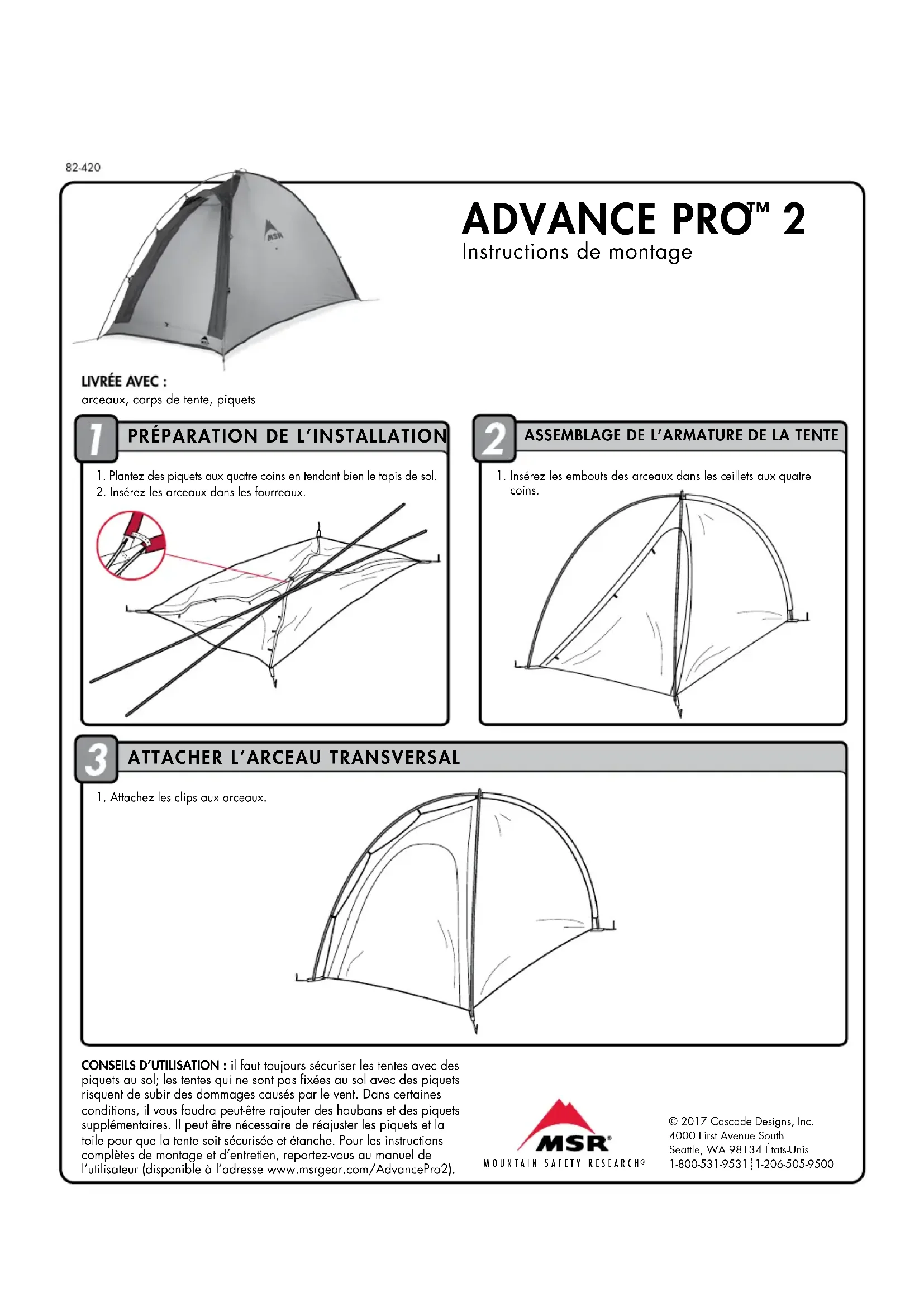 CONSEILS D’UTILISATION: il faut toujours sécuriser les tentes avec des piquets au sol; les tentes qui ne sont pas fixées au sol avec des piquets risquent de subir des dommages causés par le vent. Dans certaines conditions, il vous faudra peut-être rajouter des haubans et des piquets supplémentaires. Il peut être nécessaire de réajuster les piquets et la toile pour que la tente soit sécurisée et étanche. Pour les instructions complètes de montage et d’entretien, reportez-vous au manuel de l’utilisateur (disponible à l’adresse www.msrgear.com/AdvancePro2). 82-420 ADVANCE PRO