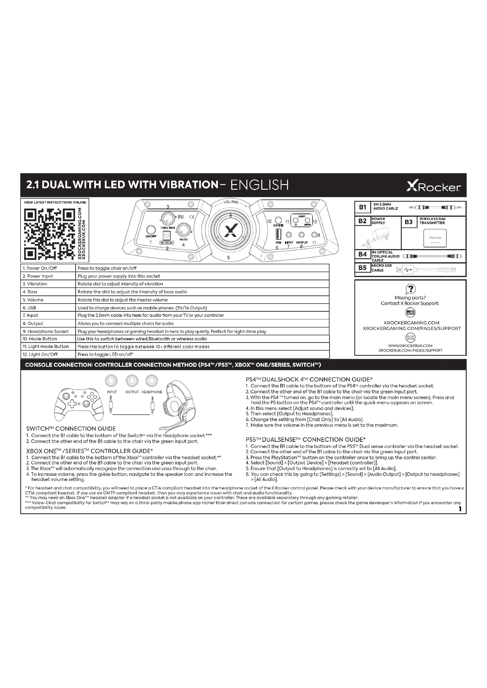 - Pour la compatibilité du casque et du chat, vous devrez placer un casque compatible CTIA dans la prise casque du panneau de commande X Rocker. Veuillez vérier auprès du fabricant de votre appareil pour vous assurer que vous disposez d’un casque conforme à la CTIA. Si vous utilisez un casque compatible OMTP, vous pouvez rencontrer des problèmes avec la fonctionnalité de chat et audio. ** Vous aurez peut-être besoin d’un adaptateur pour casque Xbox One™ si une prise casque n’est pas disponible sur votre manette. Ceux-ci sont disponibles séparément auprès de n’importe quel détaillant de jeux. *** La compatibilité Voice-Chat pour Switch™ peut reposer sur une application de téléphonie mobile tierce plutôt que sur une connexion directe à la console pour certains jeux, veuillez vérier les informations du développeur du jeu si vous rencontrez des problèmes de compatibilité.