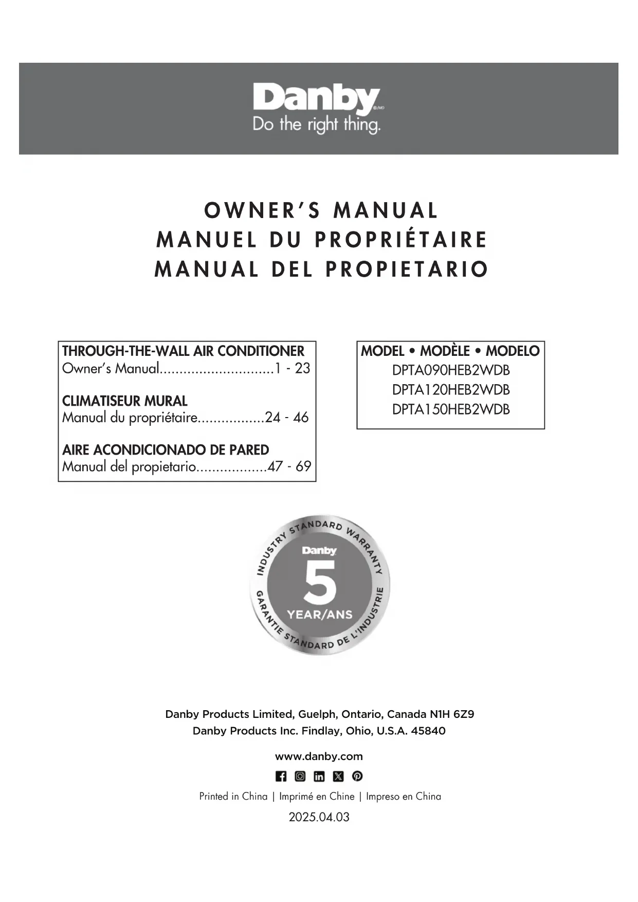 equired, present the proof of purchase to our authorized service depot. Danb y Products Limited | Guelph, Ontario, Canada N1H 6Z9 Danby Products Inc. | Findlay, Ohio, U.S.A. 45840 1-800-263-2629 08/2424 Bienvenue Bienvenue à la famille Danby. Nous sommes fiers de la qualité de nos produits et nous croyons en le service fiable. Nous vous suggérons de lire ce manual d’utilisation avant de brancher votre nouvel appareil car il contient des informations inportantes sur l’utilisation, la sécurité, le dépannage et la maintenance, afin d’assurer la fiabilité et la longévité de votre appareil. Visitez www.Danby.com pour accéder aux outils d’autoservice, aux FAQ et bien plus encore. Pour obtenir de l’aide supplémentaire, composez 1-800-263-2629. Notez les informations ci-dessous; Vous aurez besoin de cette information pour obtenir un service sous garantie. Vous devez fournir le reçu d’achat original pour valider votre garantie et recevoir le service. Numéro de modèle: _____________________________________________ Numéro de serie: _______________________________________________ Date d’achat: __________________________________________________ Besoin d’assistance? Avant d’appeler pour service, voici quelques choses que vous pouvez faire pour nous aider à mieux vous servir. Lire ce manuel du propriétaire: Il contient des instructions pour vous aider à utiliser et à maintenir votre appareil correctement. Si vous recevez un appareil endommagé: Contactez immédiatement le revendeur ou l’entrepreneur qui vous a vendu l’appareil. Gagnez du temps et de l’argent: Avant d’appeler pour service, consultez la section de dépannage à la fin de ce manuel. Cette section vous aidera à résoudre les problèmes courants pouvant survenir. 1-800-26- Danby(1-800-263-2629)GARDEZ CES INSTRUCTIONS! Consignes de sécurité importantes LIRE ET SUIVRE TOUTES LES INSTRUCTIONS DE SÉCURITÉ