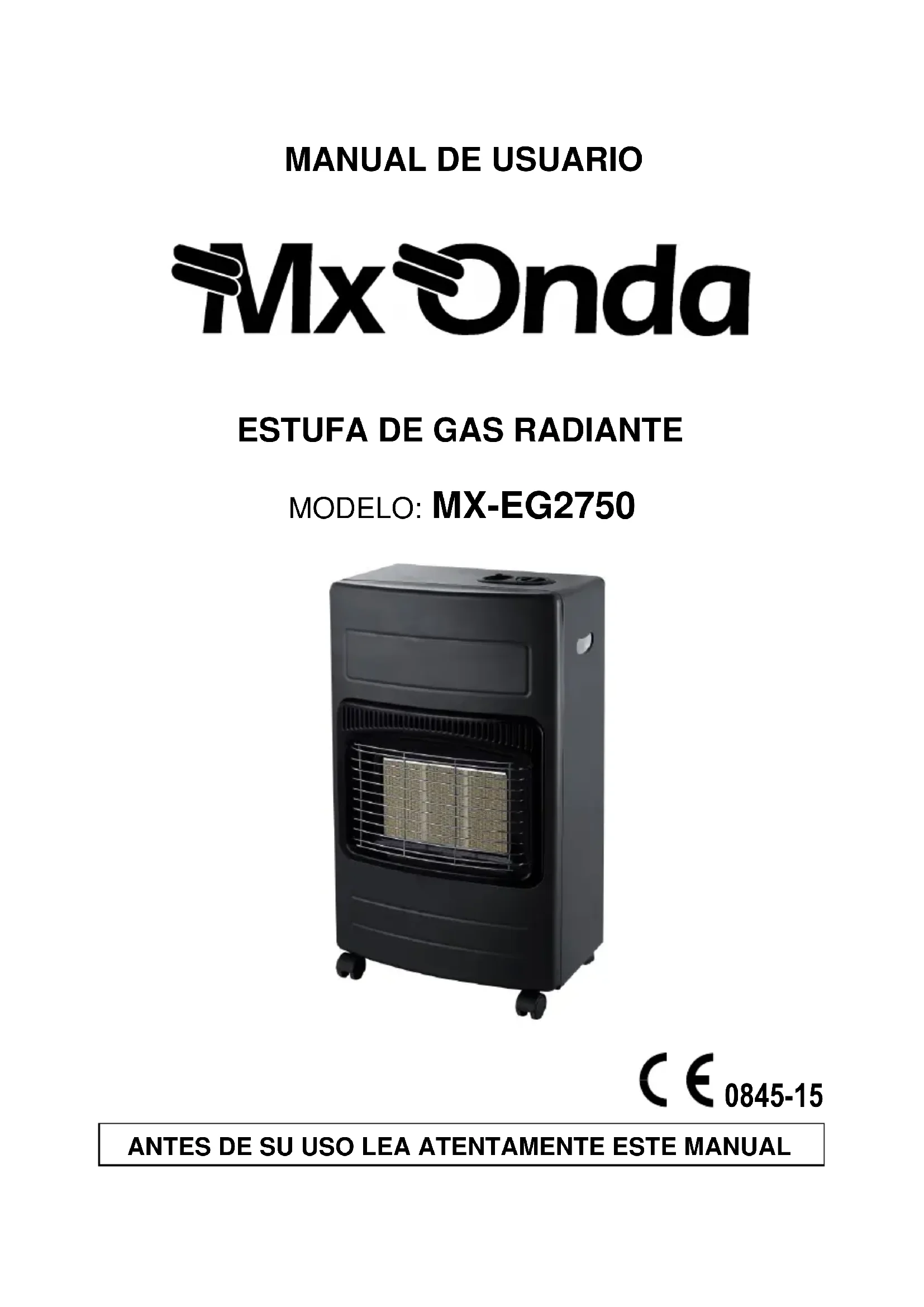 TRÈS IMPORTANT! Le régulateur et le tuyau de gaz ne sont pas inclus. L'installation du détendeur et du tuyau ne doit être effectuée que par un installateur agréé. INTRODUCTION MX ONDA vous remercie pour la déférence que vous avez eue lors de l’achat de ce produit. Le modèle de cuisinière à gaz rayonnant MX-EG2750 a été fabriqué avec des matériaux de haute qualité. Sa conception lui permet de s'adapter à tout type d'environnement. Entre autres, il présente les caractéristiques suivantes: Compatible avec le gaz butane et propane. Il admet des bouteilles de gaz de 5 à 12,5 kg, dimensions maximales de la bouteille: 32 cm de diamètre et 55 cm de hauteur. 3 niveaux de puissance thermique: 1500 W, 2800 W et 4200 W. Convient aux pièces jusqu'à 40 m². Système d'allumage piézo-électrique. Système de sécurité triple - Analyseur d'atmosphère. - Système anti-roulis. - Sécurité de la flamme. Grille de protection. Conception compacte qui facilite le stockage.