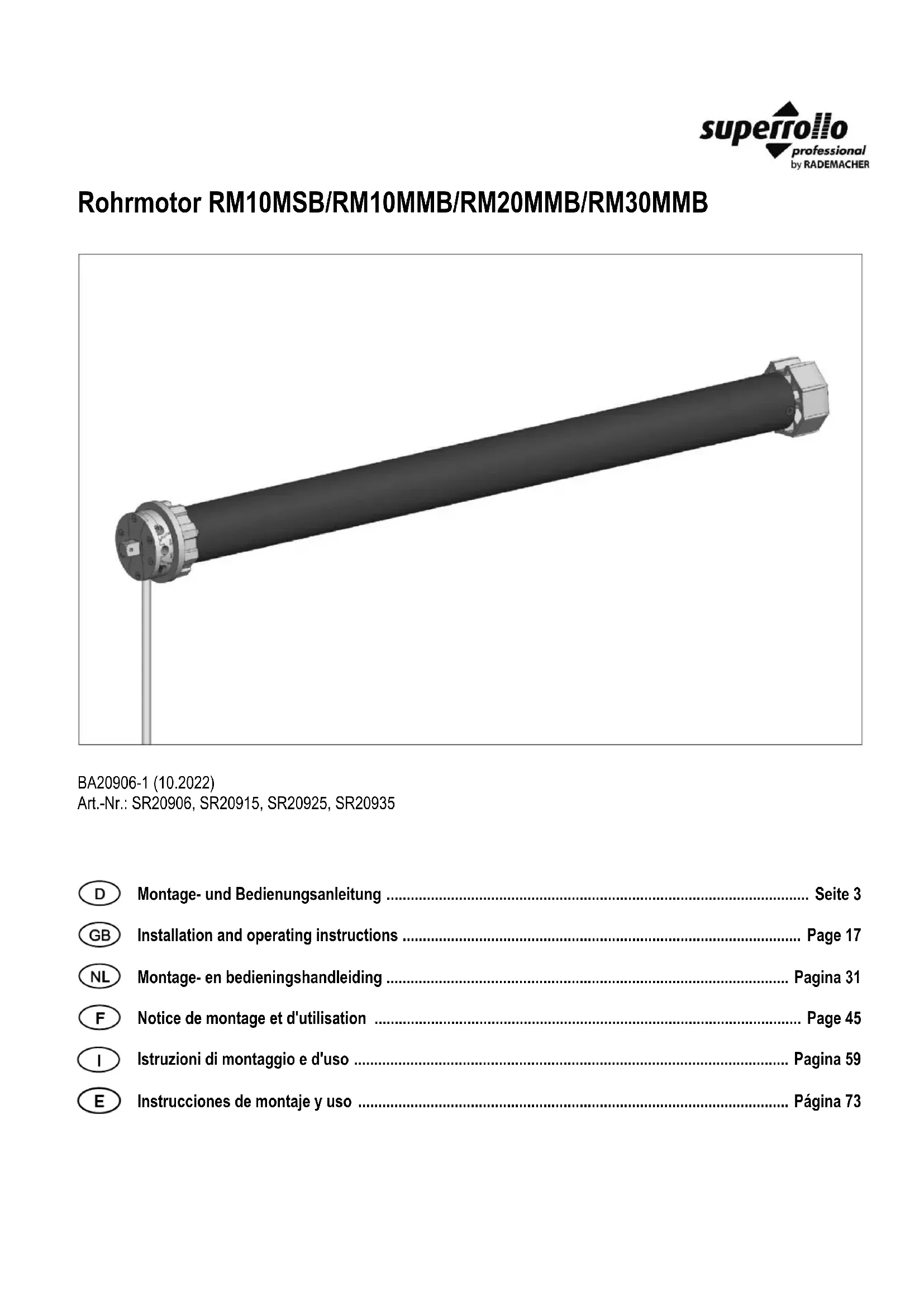 Avant-Propos Cette notice d'utilisation décrit le montage, le branchement électrique et l'utilisation des moteurs tubulaires électroniques RM10MSB/RM10MMB/ RM20MMB/RM30MMB. Avant de procéder au montage et à la première mise en service, veuillez lire attentivement cette notice d'utilisation et respectez notamment les consignes de sécurité ! Cette notice a pour but de vous aider ■ à utiliser correctement, ■ en toute sécurité et ■ avantageusement les moteurs tubulaires RM10MSB/RM10MMB/RM20MMB/RM30MMB, désignés plus brièvement Moteur. Cette notice décrit le montage et l'utilisation du moteur tubulaire avec les accessoires superrollo nécessaires. Pour désigner le moteur tubulaire conjointement à ses 'accessoires, on utilisera le terme Appareil. Cette notice d'utilisation s'adresse aux personnes : ■ qui montent cet appareil, ■ qui raccordent cet appareil, ■ qui utilisent cet appareil, ■ qui entretiennent cet appareil ou ■ qui évacuent cet appareil lorsqu'il est usagé. Toutes ces personnes doivent avoir lu et compris l’intégralité de la notice d’utilisation. Toutes les opérations effectuées sur et avec cet appareil doivent impérativement être effectuées conformément à la notice d'utilisation. La garantie s'annule en cas de dommages dus au non-respect des instructions figurant dans cette notice. La société superrollo ne pourra nullement être tenue responsable des préjudices qui en découleraient. Mise à disposition de cette notice d'utilisation Cette notice d'utilisation fait partie de l'appareil. Conservez cette notice d’utilisation toujours à proximité de l'appareil. Si vous vendez l'appareil ou si vous le remettez à un tiers, vous devez remettre la notice d'utilisation en même temps. Repères dans le texte de cette notice d'utilisation Certains passages de cette notice d'utilisation sont signalés par des repères. Vous pouvez ainsi facilement reconnaître s’il s’agit : de texte normal, de renvois, SENS DE ROTATION DES VIS DE REGLAGE, ■ d'énumérations ou ➢ des étapes d'une opération.