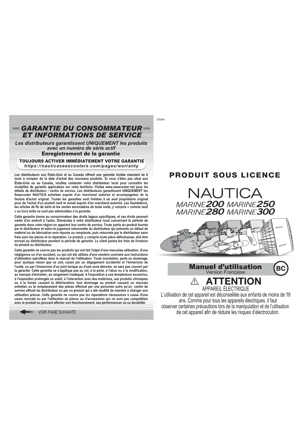 https://nauticaseascooters.com/pages/warrantyVersion Française Manuel d’utilisation APPAREIL ÉLECTRIQUE L’utilisation de cet appareil est déconseillée aux enfants de moins de 16 ans. Comme pour tous les appareils électriques, il faut observer certaines précautions lors de la manipulation et de l’utilisation de cet appareil afin de réduire les risques d’électrocution. ATTENTION PRODUIT SOUS LICENCEDéclaration FCC