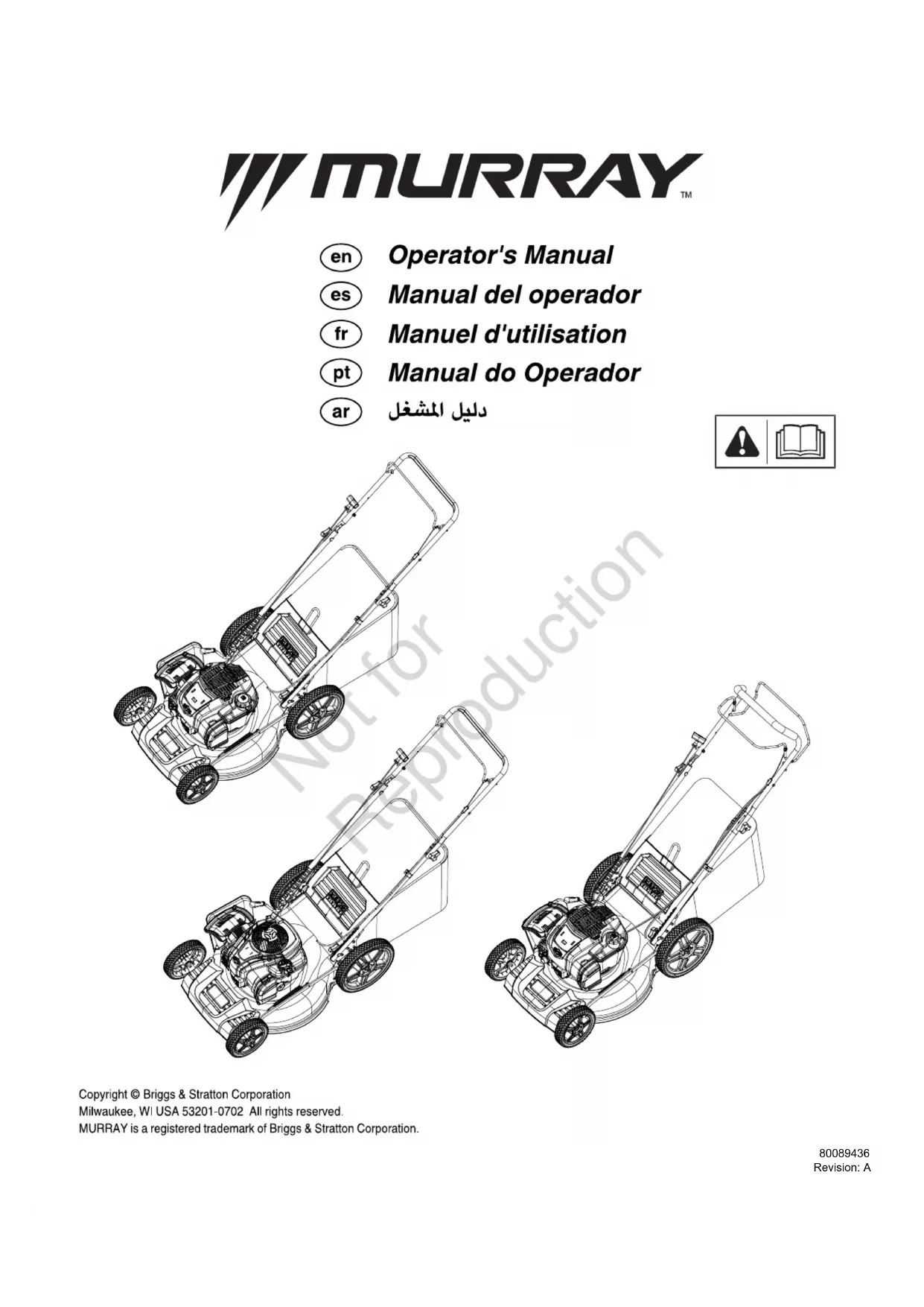 Les taux de dioxyde de carbone des moteurs Briggs &Stratton concernant les certificats d’approbation de typeUE peuvent être consultés en tapant CO2 dans la barre derecherche du site BriggsandStratton.com. Sécurité de l’utilisateur Définitions concernant la sécurité Pour votre sécurité, celle des autres et pour protéger lerendement de votre équipement, suivre les précautionsinsérées dans tout le manuel avant l’utilisation, pendantl’utilisation et pendant les procédures d’entretien périodique.Indique un risque de blessure corporelle.DANGERIndique une situation dangereuse qui, si elle n’est pas évitée,entraînera la mort ou des blessures graves.AVERTISSEMENTIndique une situation dangereuse qui, si elle n’est pas évitée,pourrait entraîner la mort ou des blessures graves.ATTENTIONIndique une situation dangereuse qui, si elle n’est pas évitée,pourrait entraîner des blessures mineures ou modérées. AVIS Indique une situation qui peut endommager l’équipement,des biens ou l’environnement ou empêcher l’équipement defonctionner correctement. Définitions des symboles de sécurité L’unité peut comporter les symboles de sécurité suivants.Lire le manuel de l’utilisateur avant de mettre la tondeuse enmarche.Tondez en travers des pentes et non vers le haut ou vers le bas.Pour éviter toute blessure, ne pas tondre à proximité d’autrespersonnes, notamment des enfants.Afin de réduire les risques d’incendie, attendre au moins2minutes avant de remettre du carburant.Not for Reproduction 36 www.murray.com Pour éviter de graves blessures, voire la mort, gardez en permanence les mains et les pieds éloignés du plateau de coupe de la tondeuse pendant l’utilisation. Pour éviter toute blessure provenant d’objets projetés, ne pas faire fonctionner la tondeuse tant que les composants de déchiquetage, d’éjection ou de ramassage d’herbe ne sont pas en place. Sécurité de fonctionnement Un équipement électrique est sûr tant que son utilisateur respecte les normes de sécurité. Il peut être dangereux s’il est utilisé de façon abusive ou s’il n’est pas correctement entretenu! Rappel: l’utilisateur est responsable de sa propre sécurité et de celle de ceux qui sont à ses côtés. Faire preuve de bon sens et rester concentré. En cas de doute sur la sécurité d’une opération à effectuer avec l’équipement choisi, s’adresser à un professionnel. Contacter le revendeur local agréé. Lecture du Manuel Le manuel d’utilisation comporte d’importantes informations relatives à la sécurité qu’il faut connaître AVANT d’utiliser la machine ainsi que PENDANT son fonctionnement. Ce manuel comporte des techniques de fonctionnement en toute sécurité, une explication des caractéristiques et des commandes de la machine, ainsi que des informations relatives à l’entretien pour profiter au maximum de votre investissement dans cet appareil. S’assurer de lire, dans son intégralité, la section sur les règles et informations relatives à la sécurité figurant dans les pages suivantes. Lire également la section sur le fonctionnement dans son intégralité. Enfants Des accidents tragiques peuvent se produire avec des enfants. Ne jamais leur permettre de se tenir à proximité de la zone d’opération. Les enfants sont souvent attirés par la machine et l’activité de tonte. Ne jamais supposer que les enfants resteront là où ils ont été vus pour la dernière fois. S’il existe un risque que des enfants puissent venir à proximité de l’endroit où l’on tond, demander à un autre adulte responsable de les surveiller. Fonctionnement en pente