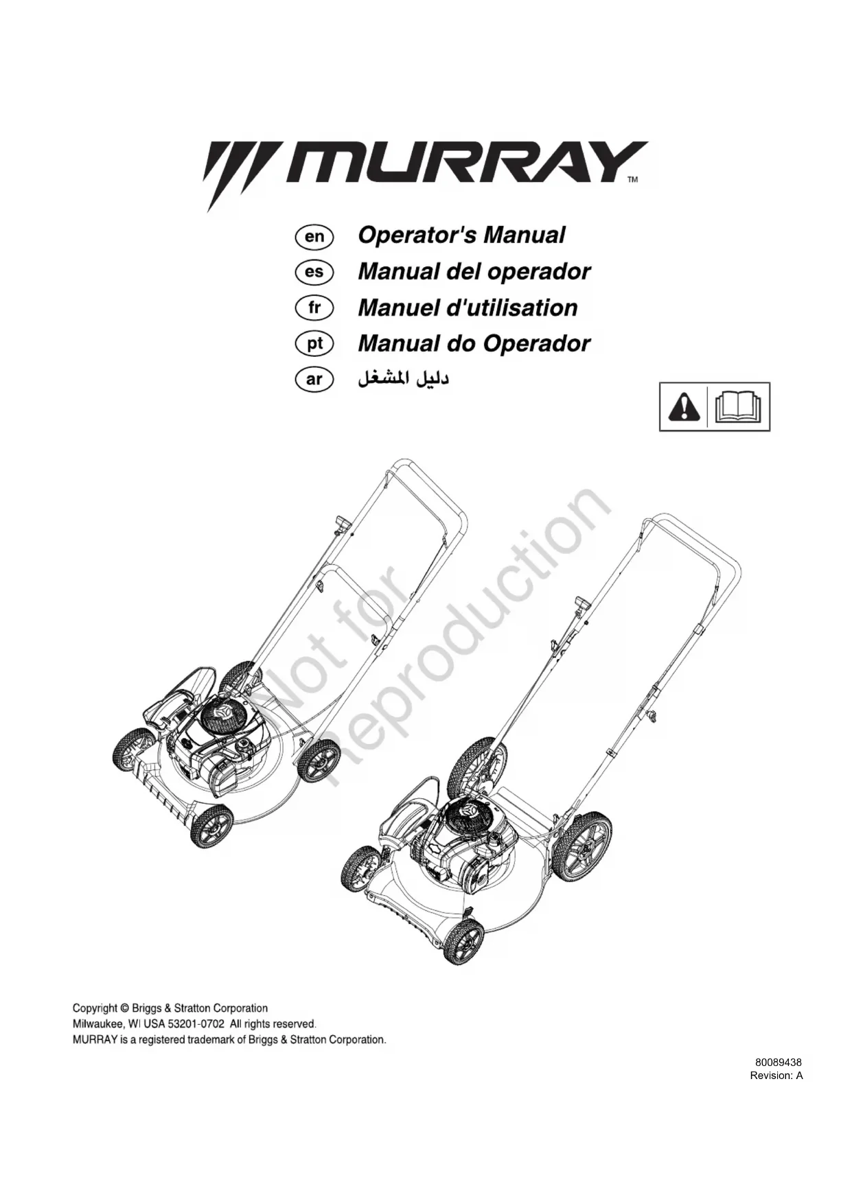- VoirPuissances nominales. Puissances nominales: La puissance nominale brute pour les modèles de moteurs à essence individuels est étiquetée conformément au code J1940 (Small Engine Power & Torque Rating Procedure) de la SAE (Society of Automotive Engineers), et est évaluée conformément à SAE J1995. Les valeurs de couple sont obtenues à 2600tr/ min pour les moteurs pour lesquels les «tours par minute» sont indiqués sur l’étiquette et à 3060tr/min pour tous les autres. La puissance en HP est obtenue à 3600tr/min. Les courbes de puissance brute peuvent être consultées sur le site www.BRIGGSandSTRATTON.COM. Les valeurs nettes de puissance sont prises avec l'échappement et le filtre à air installés, alors que les valeurs brutes de puissance sont mesurées sans ces accessoires. La puissance brute réelle du moteur sera supérieure à la puissance nette du moteur et sera affectée, entre autres, par les conditions de fonctionnement ambiantes et les différences entre moteurs. Étant donné la vaste gamme de produits sur lesquels les moteurs sont installés, le moteur à essence peut ne pas développer la puissance nominale brute lorsqu'il est utilisé pour entraîner une pièce d'appareil donnée. Cette différence est causée par différents facteurs dont, mais sans s'y limiter, la variété des composants du moteur (filtre à air, échappement, chargement, refroidissement, carburateur, pompe à essence, etc.), les limites de l'appareil, les conditions de fonctionnement ambiantes (température, humidité, altitude) et les différences entre les moteurs. En raison des limites de fabrication et de capacité , Briggs & Stratton peut substituer un moteur de plus grande puissance à ce moteur.Not for Reproduction 50 www.murray.com Conteúdo: Informações de contato do escritório na Europa............50 Segurança do operador..................................................... 50 Características e controles................................................55 Operação..............................................................................55 Manutenção......................................................................... 57 Solução de problemas....................................................... 60 Declaração de Garantia......................................................60 Guia de declives................................................................. 62 Especificações.................................................................... 63 As imagens apresentadas neste documento são representativas e destinam-se a complementar o texto instrucional que elas acompanham. A sua unidade pode variar das imagens exibidas.ESQUERDAeDIREITAsão vistas a partir da posição do operador. Obrigado por comprar este produto construído com a qualidade Murray