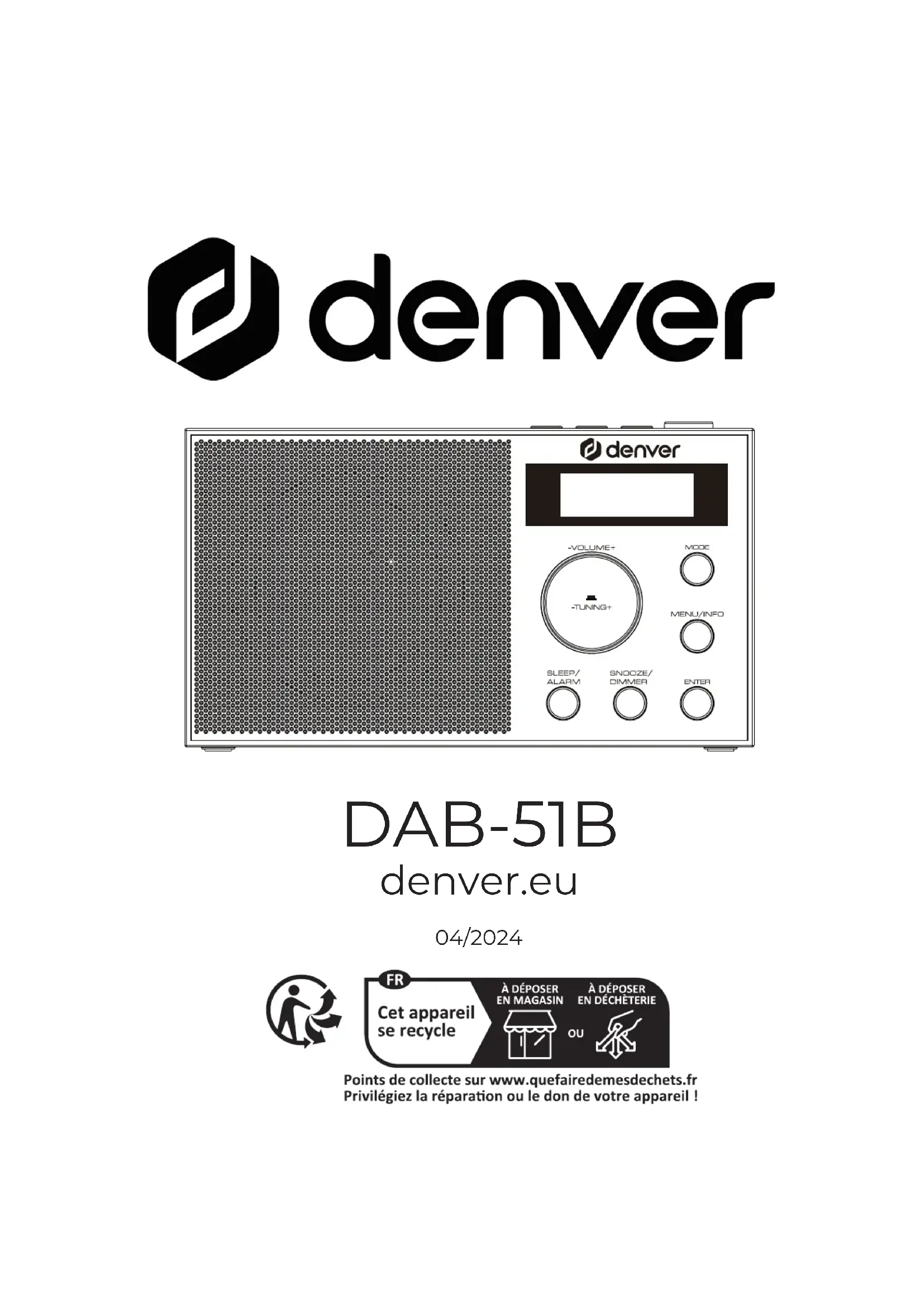 DAB-51B denver.eu 04/2024Consignes de sécurité Lisez attentivement les consignes de sécurité avant d’utiliser le produit pour la première fois et conservez-les pour référence ultérieure.