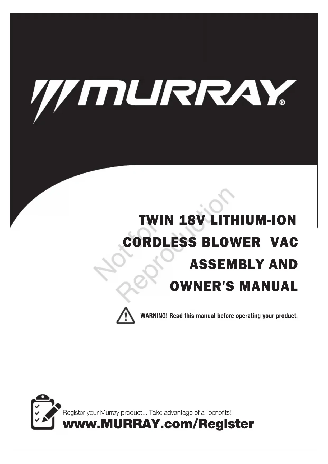 Not for Reproduction4 REMARQUES IMPORTANTES Merci d'avoir acheté votre produit Murray. Murray est fier de la qualité et des performances de tous ses produits. Ce mode d'emploi vous aidera à monter, à utiliser et à entretenir votre produit en toute sécurité. Veuillez lire les avertissements suivants pour garantir la sécurité et la longue durée de vie de votre produit. AVERTISSEMENT N'essayez pas d'utiliser ce produit avant d'avoir lu et compris complètement toutes les consignes, règles de sécurité, etc. contenues dans ce manuel. Le non-respect de ces consignes peut entraîner des accidents avec électrocution, incendie et/ou blessures graves.