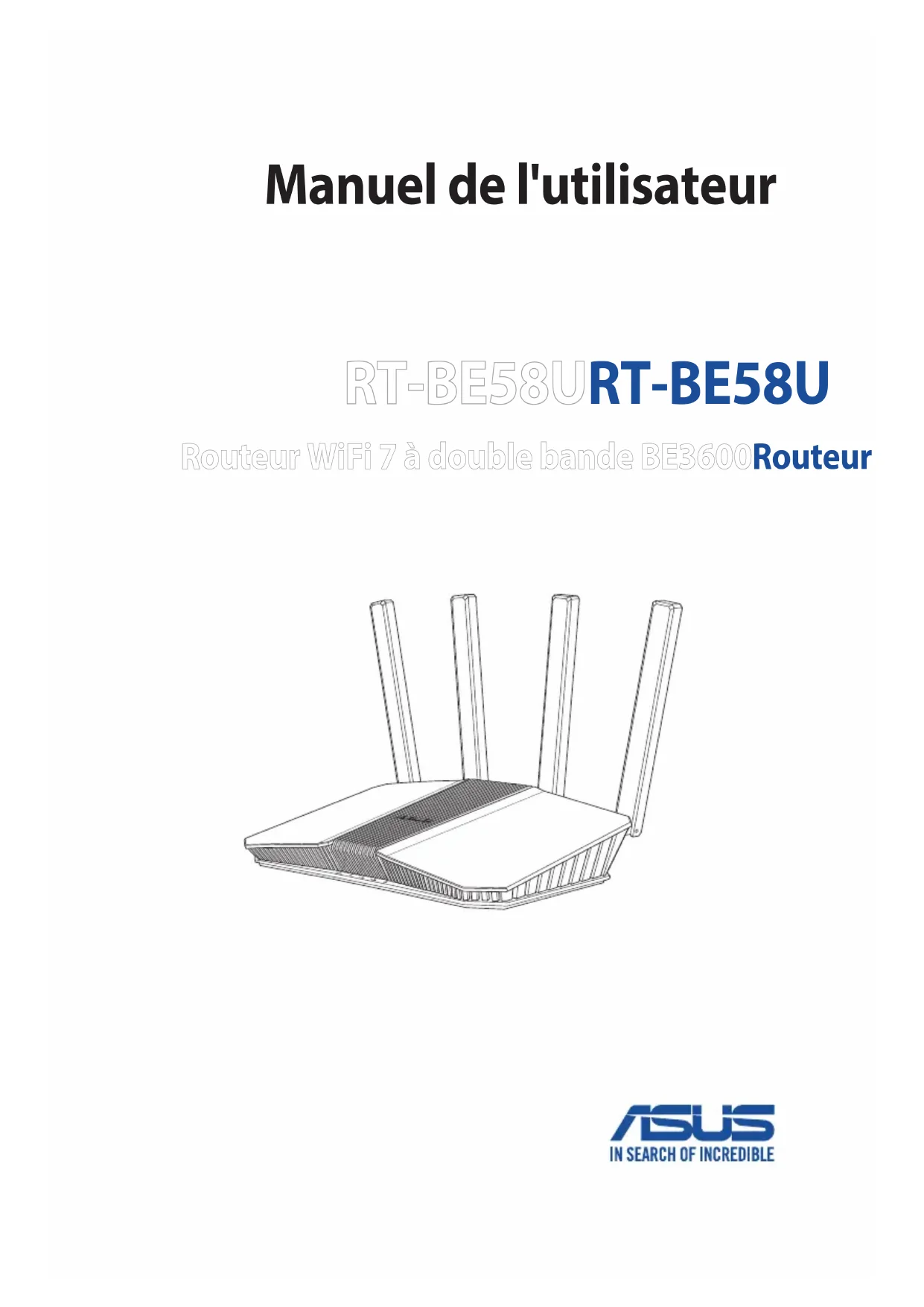 Routeur WiFi 7 à double bande BE3600Routeur WiFi 7 à double bande BE36002 Copyright © 2024 ASUSTeK Computer Inc. Tous droits réservés. Aucun extrait de ce manuel, incluant les produits et logiciels qui y sont décrits, ne peut être reproduit, transmis, transcrit, stocké dans un système de restitution, ou traduit dans quelque langue que ce soit sous quelque forme ou quelque moyen que ce soit, à l'exception de la documentation conservée par l'acheteur dans un but de sauvegarde, sans la permission écrite expresse de ASUSTeK Computer Inc ("ASUS"). La garantie sur le produit ou le service ne sera pas prolongée si (1) le produit est réparé, modié ou altéré, à moins que cette réparation, modication ou altération ne soit autorisée par écrit par ASUS ; ou (2) si le numéro de série du produit est dégradé ou manquant. ASUS fournit ce manuel "en l'état" sans garantie d'aucune sorte, explicite ou implicite, y compris, mais non limité aux garanties implicites ou aux conditions de commerciabilité ou d'adéquation à un but particulier. En aucun cas ASUS, ses directeurs, ses cadres, ses employés ou ses agents ne peuvent être tenus responsables des dégâts indirects, spéciaux, accidentels ou consécutifs (y compris les dégâts pour manque à gagner, pertes de prots, perte de jouissance ou de données, interruption professionnelle ou assimilé), même si ASUS a été prévenu de la possibilité de tels dégâts découlant de tout défaut ou erreur dans le présent manuel ou produit. Les spécications et les informations contenues dans ce manuel sont fournies à titre indicatif seulement et sont sujettes à des modications sans préavis, et ne doivent pas être interprétées comme un engagement de la part d'ASUS. ASUS n'est en aucun cas responsable d'éventuelles erreurs ou inexactitudes présentes dans ce manuel, y compris les produits et les logiciels qui y sont décrits. Les noms des produits et des sociétés qui apparaissent dans le présent manuel peuvent être, ou non, des marques commerciales déposées, ou sujets à copyrights pour leurs sociétés respectives, et ne sont utilisés qu'à des ns d'identication ou d'explication, et au seul bénéce des propriétaires, sans volonté d'infraction. F23503 Première Édition Juin 20243 Table des matières 1 Présentation de votre routeur WiFi 6