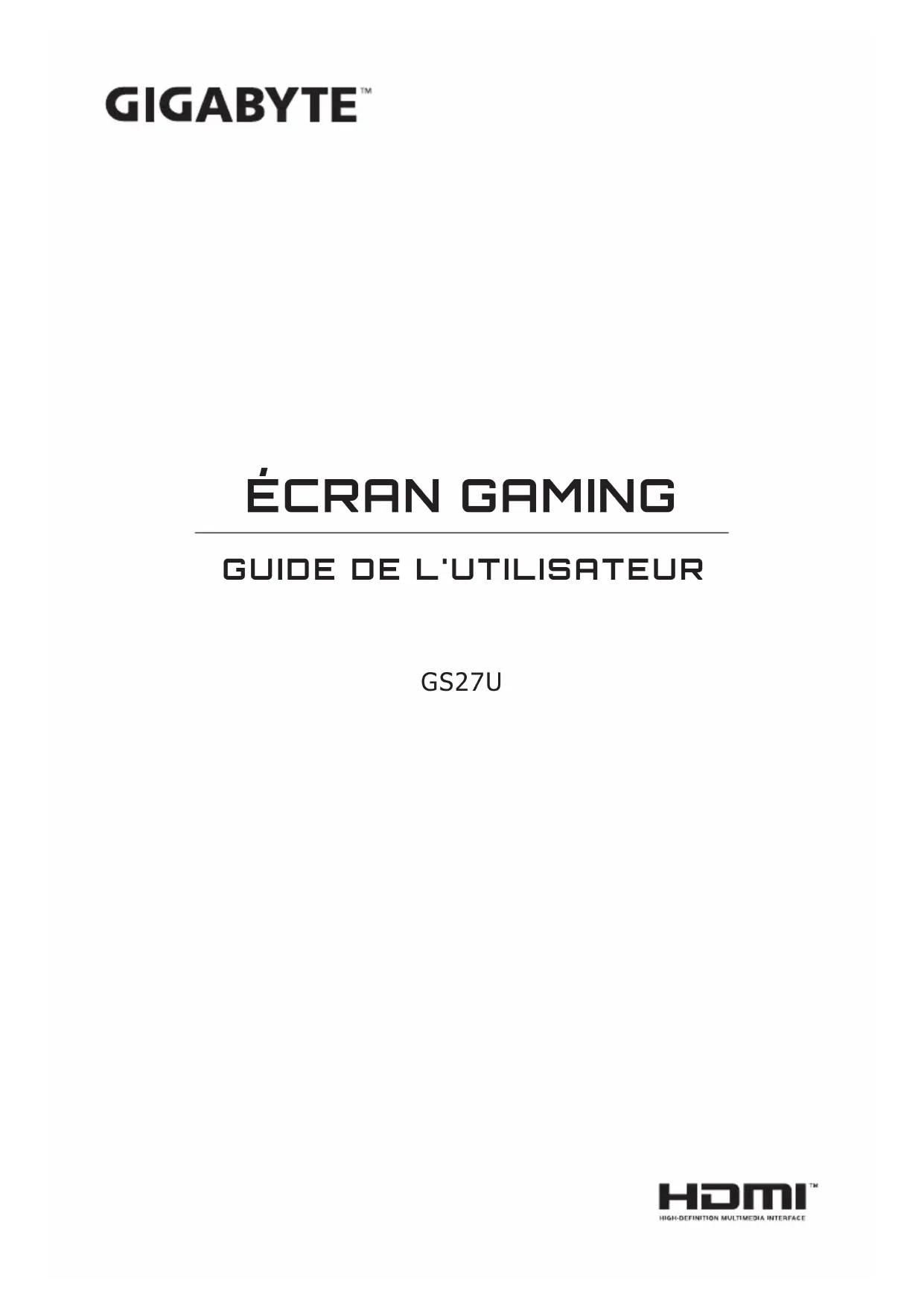 GS27UCopyright © 2024 GIGA-BYTE TECHNOLOGY CO., LTD. Tous droits réservés. Les marques commerciales mentionnées dans ce manuel sont légalement enregistrées au nom de leurs propriétaires respectifs. Limitation de responsabilité Les informations contenues dans ce manuel sont protégées par les lois sur les droits d'auteur et sont la propriété de GIGABYTE. GIGABYTE se réserve le droit de modifier les spécifications ou les fonctions décrites dans ce manuel sans préavis. Aucune partie de ce manuel ne peut être reproduite, copiée, traduite, transmise ou publiée sous quelque forme ou par quelque moyen que ce soit sans l'autorisation écrite préalable de GIGABYTE.