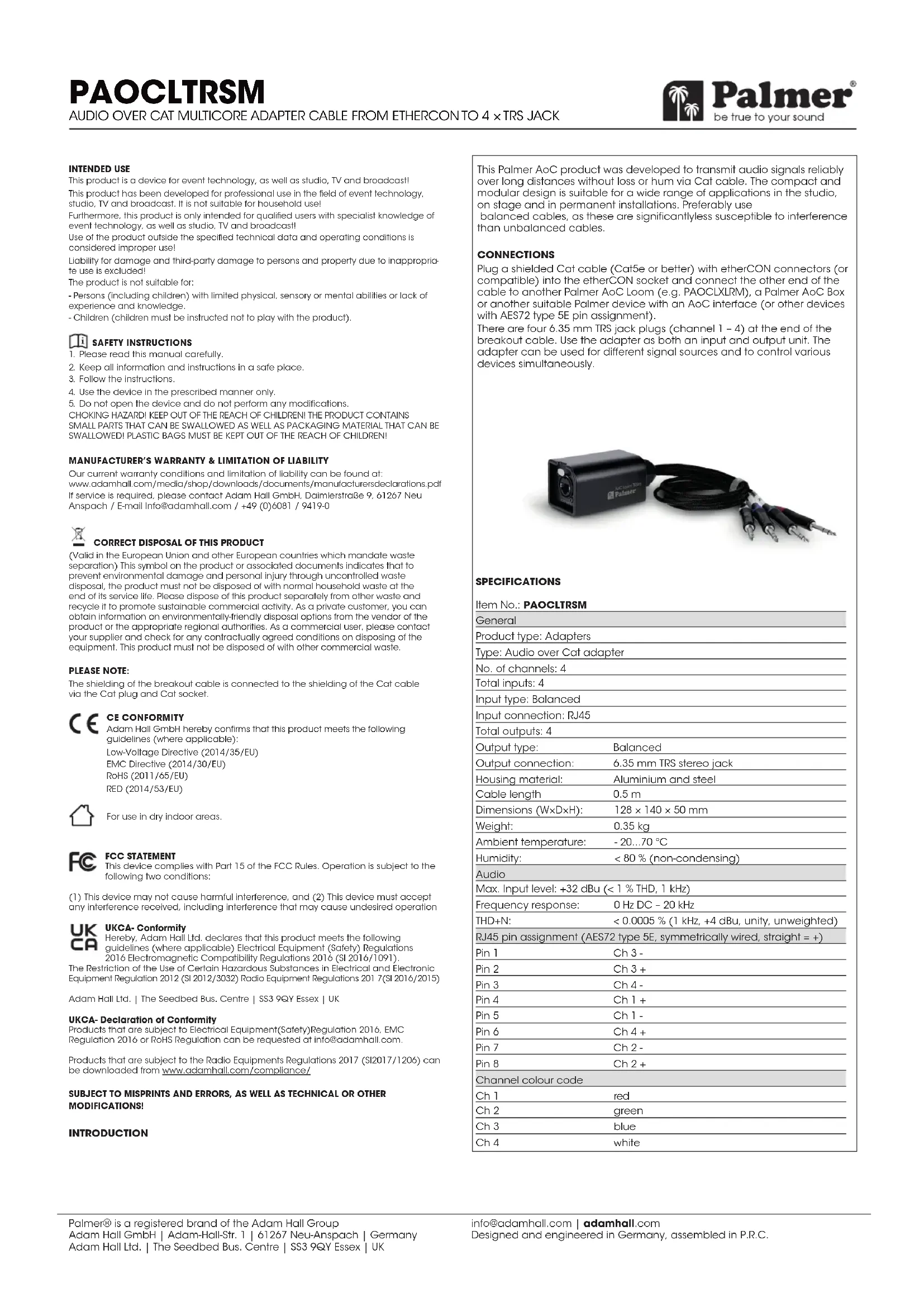 (Applicable au sein de l’Union européenne et d’autres pays européens pratiquant le tri sélectif) La présence de ce pictogramme sur le produit ou sa documentation indique qu’en fin de vie, l’appareil ne doit pas être éliminé avec les autres déchets domestiques afin d’éviter toute atteinte à l’environnement et à la santé humaine résultant d’une élimination incontrôlée des déchets. Veuillez éliminer ce produit séparément des autres déchets et veiller à son recyclage pour la promotion des circuits économiques durables. En tant que particulier, vous pouvez obtenir des informations sur les possibilités d'élimination respectueuse de l'environnement auprès du vendeur du produit ou des autorités régionales compétentes. Si vous êtes un utilisateur professionnel, veuillez contacter votre fournisseur et vérifier les éventuelles clauses du contrat concernant l’élimination de l’appareil. Ce produit ne doit pas être éliminé avec les autres déchets issus d’activités professionnelles. REMARQUE: Les blindages de l'épanoui sont reliés au blindage du câble Cat via le connecteur Cat et l'embase Cat. CONFORMITÉCE Par la présente, Adam Hall GmbH déclare que ce produit est conforme aux directives suivantes(si applicables): Directive basse tension (2014/35/UE) Directive CEM (2014/30/UE) RoHS (2011/65/UE) RED (2014/53/UE) Pour une utilisation en intérieur sec. SOUS RÉSERVE DE FAUTES D’IMPRESSION ET D’ERREURS, AINSI QUE DE MODIFICATIONS TECHNIQUES OU AUTRES! INTRODUCTION Ce produit Palmer AoC a été conçu pour transporter en toute fiabilité des signaux audio sur de longues distances sur un câble réseau de type Cat, sans perte ni parasites. Sa conception compacte et modulaire convient à une grande variété d'applications en studio, sur scène et pour les installa- tions fixes. Utilisez de préférence des câbles symétriques, car ils sont nettementmoins sensibles aux interférences que les câbles asymétriques. RACCORDEMENTS Branchez un câble Cat blindé (Cat5e ou mieux) doté de connecteurs etherCON (ou compatibles) dans l'embase etherCON et connectez l'autre extrémité du câble à un autre épanoui Palmer AoC (par exemple, un PAOCLXLRM), un boîtier Palmer AoC ou un autre appareil Palmer approprié doté d'une interface AoC (ou tout autre appareil avec un brochage AES72 type 5E). À l'extrémité de l'épanoui se trouvent quatre jacks TRS de diamètre 6,35mm (canaux 1 à 4). Vous pouvez utiliser l'adaptateur à la fois comme interface d'entrée et de sortie. L'adaptateur peut être utilisé pour différentes sources de signaux et pour contrôler différents appareils simultanément. Référence: PAOCLTRSM Généralités Catégorie de produit: Adaptateurs Type: Adaptateur audio sur câble Cat Nombre de canaux: 4 Nombre d’entrées: 4 Type d'entrée: Symétriques Connecteur d'entrée: RJ45 Nombre de sorties: 4 Type de sortie: Symétriques Connecteurs de sortie : jack TRS 6,35mm Matériau du boîtier: Aluminium et acier Longueur de câble: 0,5m Dimensions (L×P×H): 128 × 140 × 50 mm Poids: 0,35kg Température ambiante: - 20...70 °C Humidité atmosphérique: <80 %, sans condensation Audio Niveau maximal d'entrée: +32 dBu (pour < 1% THD, à 1kHz) Réponse en fréquence: 0Hz (tension continue) - 20kHz THD+N: < 0,0005 % (à 1kHz, +4dBu, gain unitaire, sans pondération) Affectation des broches du connecteur RJ45 (AES72 type 5E, câblage symétrique, point chaud = +) Broche1 Ch 3 - (point froid canal 3) Broche2 Ch 3 + (point chaud canal 3) Broche3 Ch 4 - (point froid canal 4) Broche4 Ch 1 + (point chaud canal 1) Broche5 Ch 1 - (point froid canal 1) Broche 6 Ch 4 + (point chaud canal 4) Broche 7 Ch 2 - (point froid canal 2) Broche 8 Ch 2 + (point chaud canal 2) Code couleur du canal Canal 1 Rouge Canal 2 Vert Canal 3 Bleu Canal 4 Blanc SPÉCIFICATIONSPalmer® is a registered brand of the Adam Hall Group Adam Hall GmbH | Adam-Hall-Str. 1 | 61267 Neu-Anspach | Germany Adam Hall Ltd. | The Seedbed Bus. Centre | SS3 9QY Essex | UK info@adamhall.com | adamhall.com Designed and engineered in Germany, assembled in P.R.C. PAOCLTRSM CABLE ADAPTADOR MULTIPAR AUDIO OVER CAT, DE ETHERCON A 4JACKSTRS USO PREVISTO Este producto está pensado para el sector de eventos, así como para radiodifusión, estudios y televisión. Este producto ha sido desarrollado para uso profesional en el sector de eventos, estudios, platós de televisión y radiodifusión, y no está diseñado para el uso doméstico. Además, este producto está destinado a ser utilizado por usuarios cualificados con con- ocimientos especializados sobre tecnología para eventos, estudios, platós de televisión y radiodifusión. Se considerará contrario al uso previsto utilizar este producto fuera de las condiciones de funcionamiento y los datos técnicos especificados. Queda excluida toda responsabilidad por daños y perjuicios a personas y objetos si se utiliza el producto fuera del uso previsto. El producto no es adecuado para: — Personas (incluidos niños) con capacidades físicas, sensoriales o mentales reducidas o con falta de experiencia y conocimientos. — Niños (los niños deben recibir instrucciones de no jugar con este equipo).