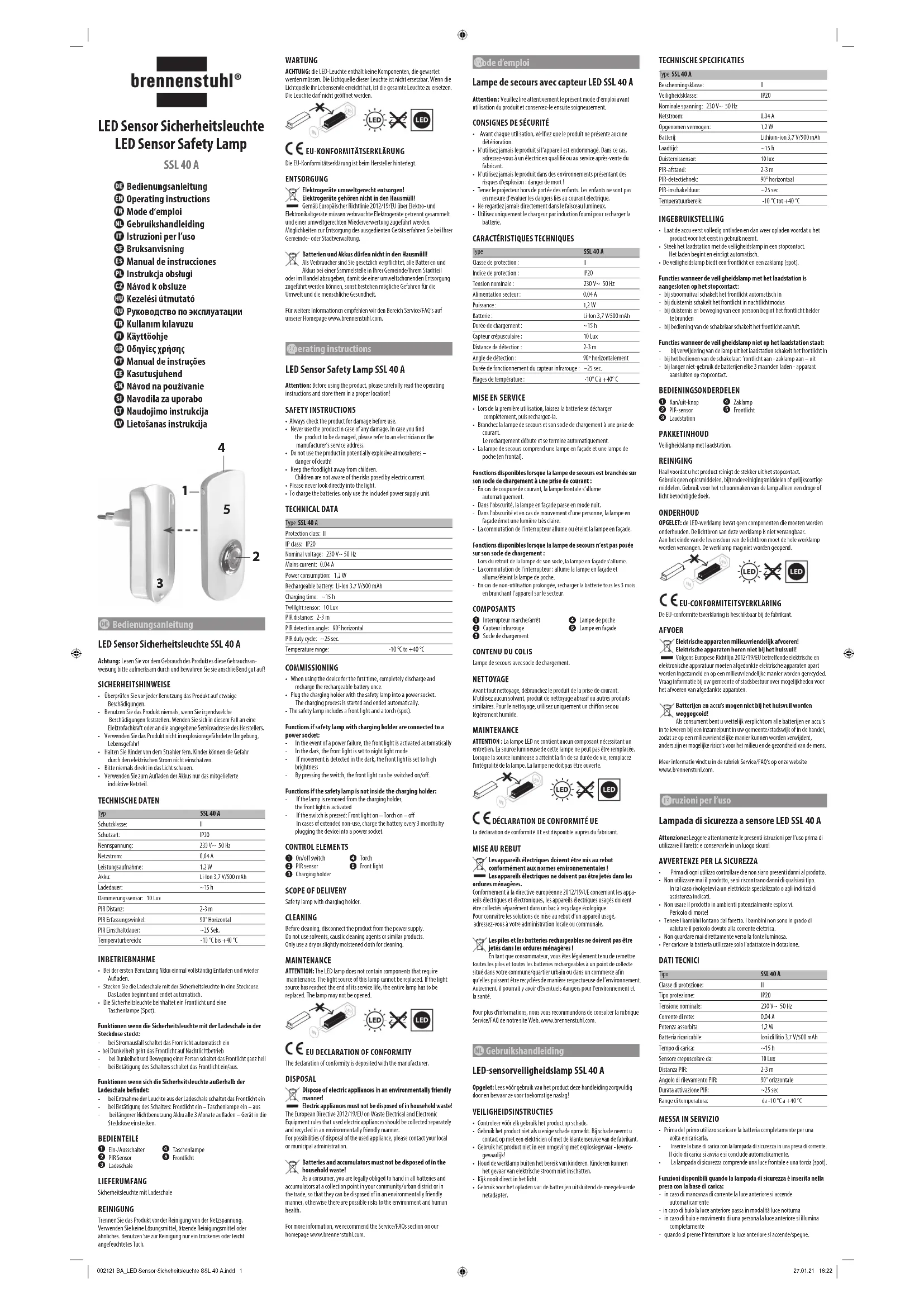 Les appareils électriques doivent être mis au rebut conformément aux normes environnementales ! Les appareils électriques ne doivent pas être jetés dans les ordures ménagères.Conformément à la directive européenne 2012/19/UE concernant les appa-reils électriques et électroniques, les appareils électriques usagés doivent être collectés séparément dans un bac à recyclage écologique.Pour connaître les solutions de mise au rebut d‘un appareil usagé, adressez-vous à votre administration locale ou communale.Les piles et les batteries rechargeables ne doivent pas être jetés dans les ordures ménagères !En tant que consommateur, vous êtes légalement tenu de remettre toutes les piles et toutes les batteries rechargeables à un point de collecte situé dans votre commune/quartier urbain ou dans un commerce an qu‘elles puissent être recyclées de manière respectueuse de l’environnement. Autrement, il pourrait y avoir d’éventuels dangers pour l‘environnement et la santé.Pour plus d‘informations, nous vous recommandons de consulter la rubrique Service/FAQ de notre site Web. www.brennenstuhl.com. Gebruikshandleiding LED-sensorveiligheidslamp SSL 40 A Opgelet: Lees vóór gebruik van het product deze handleiding zorgvuldig door en bewaar ze voor toekomstige naslag! VEILIGHEIDSINSTRUCTIES