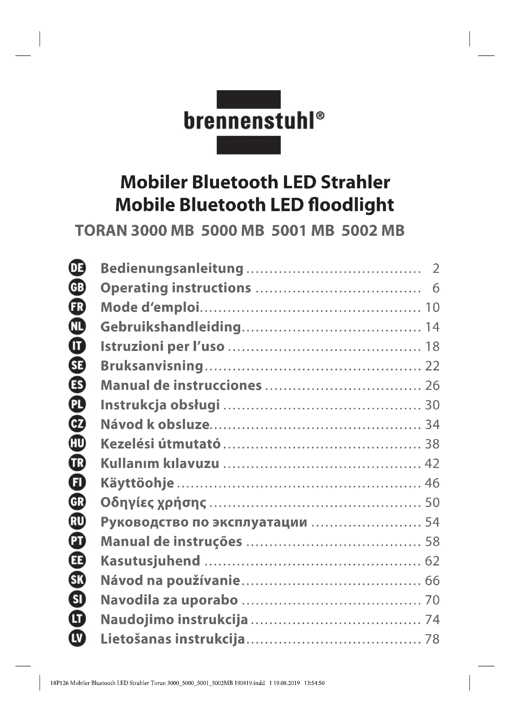Nous, l’entreprise Hugo Brennenstuhl GmbH & Co.KG, déclarons par la présente que le système radio TORAN 3000 MB, 5000 MB, 5001 MB, 5002 MB est conforme aux directives 2014/53/CE et 2011/65/EU (RoHS II) y compris la directive 2015/863/EU. Le texte complet de la déclaration de conformité européenne est disponible à l’adresse suivante : www.brennenstuhl.com/konformitaetserklaerung/ke_1171470301.pdf www.brennenstuhl.com/konformitaetserklaerung/ke_1171470501.pdf www.brennenstuhl.com/konformitaetserklaerung/ke_1171471501.pdf www.brennenstuhl.com/konformitaetserklaerung/ke_1171472501.pdf Cet appareil est conforme aux exigences légales nationales et européennes. Tous les noms de sociétés et de produits sont des marques déposées pour leurs propriétaires respectifs. ADRESSES Hugo Brennenstuhl GmbH & Co. KG Seestraße 1 – 3 · D-72074 Tübingen H. Brennenstuhl S.A.S. 4 rue de Bruxelles ∙ F-67170 Bernolsheim lectra-t ag Blegistrasse 13 · CH-6340 Baar www.brennenstuhl.com 18P126 Mobiler Bluetooth LED Strahler Toran 3000_5000_5001_5002MB 190819.indd 13 19.08.2019 13:54:5314 Gebruikshandleiding Mobiele led-werklamp met Bluetooth