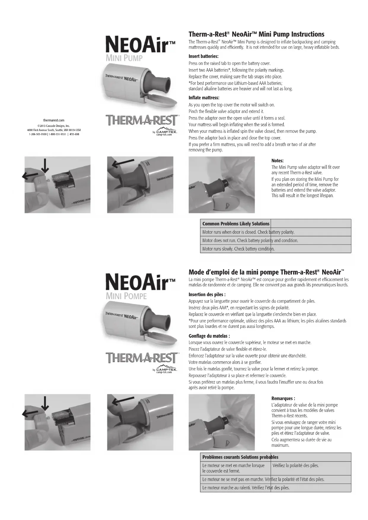 NeoAir™ est conçue pour gonfler rapidement et efficacement les matelas de randonnée et de camping. Elle ne convient pas aux grands lits pneumatiques lourds. Insertion des piles : Appuyez sur la languette pour ouvrir le couvercle du compartiment de piles. Insérez deux piles AAA*, en respectant les signes de polarité. Replacez le couvercle en vérifiant que la languette s’enclenche bien en place. *Pour une performance optimale, utilisez des piles AAA au lithium; les piles alcalines standards sont plus lourdes et ne durent pas aussi longtemps. Gonflage du matelas : Lorsque vous ouvrez le couvercle supérieur, le moteur se met en marche. Pincez l’adaptateur de valve flexible et étirez-le. Enfoncez l’adaptateur sur la valve ouverte pour obtenir une étanchéité. Votre matelas commence alors à se gonfler. Une fois le matelas gonflé, tournez la valve pour la fermer et retirez la pompe. Repoussez l’adaptateur à sa place et refermez le couvercle. Si vous préférez un matelas plus ferme, il vous faudra l’insuffler une ou deux fois après avoir retiré la pompe. Problèmes courants Solutions probables Le moteur se met en marche lorsque le couvercle est fermé. Vérifiez la polarité des piles. Le moteur ne se met pas en marche. Vérifiez la polarité et l’état des piles. Le moteur marche au ralenti. Vérifiez l’état des piles. Remarques : L’adaptateur de valve de la mini pompe convient à tous les modèles de valves Therm-a-Rest récents. Si vous envisagez de ranger votre mini pompe pour une longue durée, retirez les piles et étirez l’adaptateur de valve. Cela augmentera sa durée de vie au maximum. MINI POMPEMINIPUMPE camp-tek.com Häufige Probleme Wahrscheinliche LösungenMotor läuft bei geschlossener Abdeckung weiter. Überprüfen Sie die Batteriepolarität.Motor läuft nicht. Überprüfen Sie die Batteriepolarität sowie den Batteriezustand.Motor läuft langsam. Überprüfen Sie den Batteriezustand. camp-tek.com