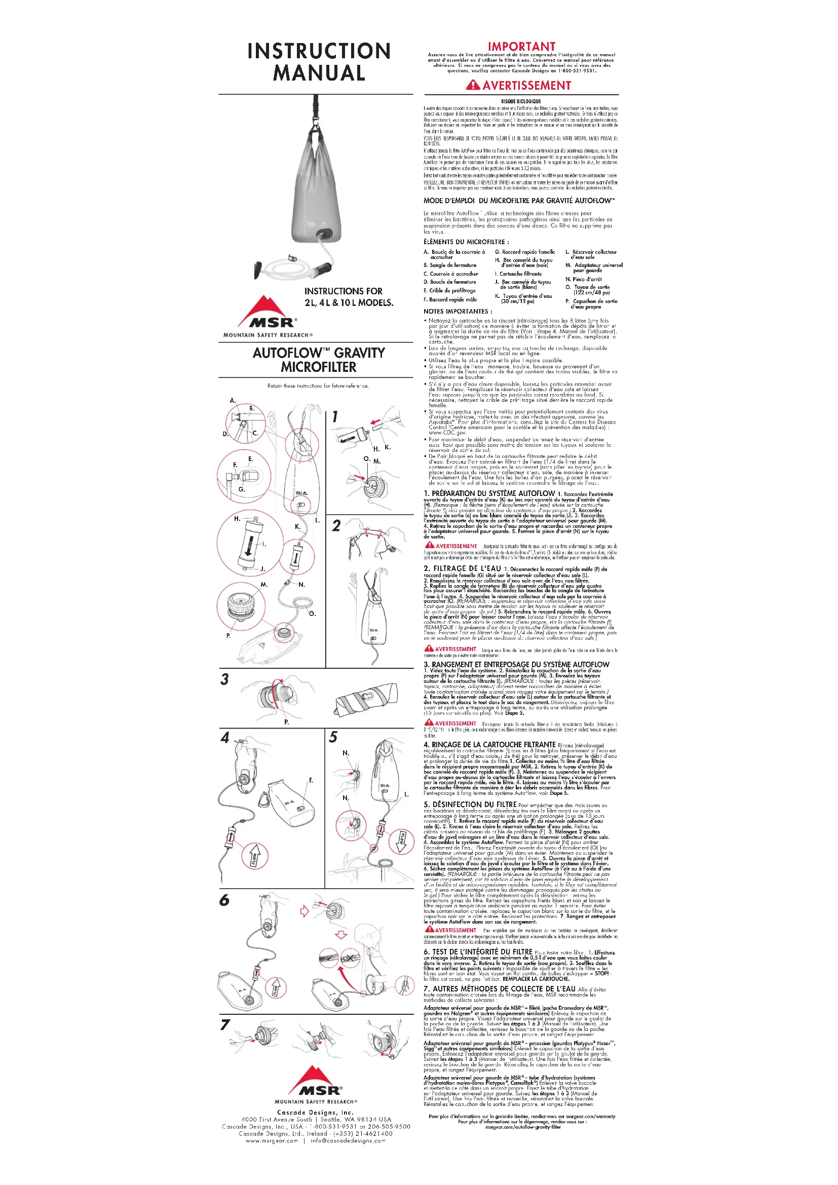et autres équipements similaires) Enlevez le capuchon de la sortie d’eau propre. Enfoncez l'adaptateur universel pour gourde sur le goulot de la gourde. Suivez les étapes 1 à 3 (Manuel de l’utilisateur). Une fois l'eau filtrée et collectée, revissez le bouchon de la gourde. Réinstallez le capuchon de la sortie d’eau propre, et rangez l’équipement.Adaptateur universel pour gourde de MSR – tube d’hydratation (systèmes d'hydratation mains-libres Platypus , CamelBak ) Enlevez la valve buccale et mettez-la de côté dans un endroit propre. Fixez le tube d'hydratation sur l'adaptateur universel pour gourde. Suivez les étapes 1 à 3 (Manuel de l’utilisateur). Une fois l'eau filtrée et recueillie, réinstallez la valve buccale. Réinstallez le capuchon de la sortie d’eau propre, et rangez l’équipement.Manipulez la cartouche filtrante avec soin car un filtre endommagé ne protège pas de l'exposition aux micro-organismes nuisibles. En cas de chute du filtre d'1,5mètre (5pieds) ou plus sur une surface dure, vérifiez qu'il n'est pas endommagé (Voir Test d’intégrité du filtre.) Si le filtre est endommagé, ne l'utilisez plus et remplacez la cartouche. AVERTISSEMENTLorsque vous filtrez de l'eau, ne faites jamais gicler de l'eau sale ou non filtrée dans le conteneur de sortie pour éviter toute contamination.AVERTISSEMENTN’entreposez jamais la cartouche filtrante à des températures froides (inférieures à 0°C/32°F): si le filtre gèle, cela endommagera les fibres internes de manière irréversible. Lavez et séchez toujours les pièces du filtre.AVERTISSEMENTPour empêcher que des moisissures ou des bactéries se développent, désinfectez soigneusement le filtre avant un entreposage prolongé. N'utilisez jamais le lave-vaisselle ou le four à micro-ondes pour désinfecter les éléments car la chaleur élevée les endommagera ou les fera fondre.AVERTISSEMENTPour plus d’informations sur la garantie limitée, rendez-vous sur msrgear.com/warranty Pour plus d’informations sur le dépannage, rendez-vous sur: msrgear.com/autoflow-gravity-filterNOTES IMPORTANTES:• Nettoyez la cartouche en la rinçant (rétrolavage) tous les 8litres (une fois par jour d’utilisation) de manière à éviter la formation de dépôts de limon et à augmenter la durée de vie du filtre (Voir l’étape4, Manuel de l'utilisateur). Si le rétrolavage ne permet pas de rétablir l'écoulement d'eau, remplacez la cartouche.• Lors de longues sorties, emportez une cartouche de rechange, disponible auprès d’un revendeur MSR local ou en ligne.• Utilisez l'eau la plus propre et la plus limpide possible.• Si vous filtrez de l’eau limoneuse, trouble, boueuse ou provenant d’un glacier, ou de l’eau couleur de thé qui contient des tanins visibles, le filtre va rapidement se boucher. • S’il n’y a pas d’eau claire disponible, laissez les particules retomber avant de filtrer l’eau. Remplissez le réservoir collecteur d'eau sale et laissez l'eau reposer jusqu'à ce que les particules soient retombées au fond. Si nécessaire, nettoyez le crible de préfiltrage situé derrière le raccord rapide femelle.• Si vous suspectez que l'eau traitée peut potentiellement contenir des virus d'origine hydrique, traitez-la avec un désinfectant approuvé, comme les Aquatabs . Pour plus d’informations, consultez le site du Centers for Disease Control (Centre américain pour le contôle et la prévention des maladies) : www.CDC.gov. • Pour maximiser le débit d’eau, suspendez ou tenez le réservoir d’entrée aussi haut que possible sans mettre de tension sur les tuyaux ni soulever le réservoir de sortie du sol.• De l'air bloqué en haut de la cartouche filtrante peut réduire le débit d'eau. Évacuez l'air coincé en filtrant de l'eau (1/4de litre) dans le conteneur d’eau propre, puis en le soulevant (sans plier les tuyaux) pour le placer au-dessus du réservoir collecteur d’eau sale, de manière à inverser l'écoulement de l'eau. Une fois les bulles d'air purgées, placez le réservoir de sortie sur le sol et laissez le système reprendre le filtrage de l'eau. IMPORTANT Assurez-vous de lire attentivement et de bien comprendre l'intégralité de ce manuel avant d'assembler ou d'utiliser le filtre à eau. Conservez ce manuel pour référence ultérieure. Si vous ne comprenez pas le contenu du manuel ou si vous avez des questions, veuillez contacter Cascade Designs au 1-800-531-9531. MODE D'EMPLOI DU MICROFILTRE PAR GRAVITÉ AUTOFLOW