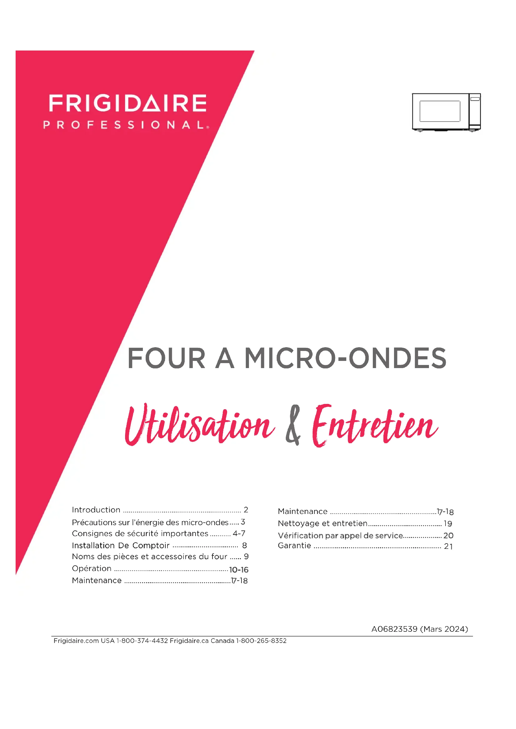 ..................................Merci de faire entrer Frigidaire dans votre maison ! Nous considérons votre achat comme le début d'une longue relation ensemble. Ce manuel est votre ressource pour l’utilisation et l’entretien de votre produit. Veuillez le lire avant d’utiliser votre appareil. Gardez-le à portée de main pour une consultation rapide. En cas de toute résoudre les problèmes courants. Des FAQ, des conseils et des vidéos utiles, des produits de nettoyage et des accessoires de cuisine et de maison sont disponibles sur le site www. frigidaire.com. Nous sommes à votre disponible ! Visitez notre site web, discutez avec un agent ou appelez-nous si vous avez besoin d’aide. Nous pouvons peut-être vous aider à éviter une visite de service. Si vous avez besoin d’un service, nous pouvons le mettre en place pour vous. Rendons-le ociel ! Assurez-vous d’enregistrer votre produit. Conservez les informations sur vos produits ici afin qu’elles soient faciles à trouver. Numéro de modèle : Numéro de série : Date d’achat :