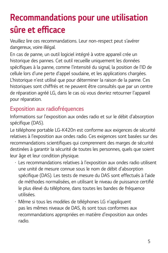 Recommandations pour une utilisation sûre et efficace Veuillez lire ces recommandations. Leur non-respect peut s'avérer dangereux, voire illégal. En cas de panne, un outil logiciel intégré à votre appareil crée un historique des pannes. Cet outil recueille uniquement les données spécifiques à la panne, comme l'intensité du signal, la position de l'D de cellule lors d'une perte d'appel soudaine, et les applications chargées. L'historique n'est utilisé que pour déterminer la raison de la panne. Ces historiques sont chiffrés et ne peuvent être consultés que par un centre de réparation agréé LG, dans le cas où vous devriez retourner l'appareil pour réparation. Exposition aux radiofréquences Informations sur l'exposition aux ondes radio et sur le débit d'absorption spécifique (DAS). Le téléphone portable LG-K420n est conforme aux exigences de sécurité relatives à l'exposition aux ondes radio. Ces exigences sont basées sur des recommandations scientifiques qui comprennent des marges de sécurité destinées à garantir la sécurité de toutes les personnes, quels que soient leur âge et leur condition physique. + Les recommandations relatives à l'exposition aux ondes radio utilisent une unité de mesure connue sous le nom de débit d'absorption spécifique (DAS). Les tests de mesure du DAS sont effectués à l'aide de méthodes normalisées, en utilisant le niveau de puissance certifié le plus élevé du téléphone, dans toutes les bandes de fréquence utilisées. + Même si tous les modèles de téléphones LG n'appliquent pas les mêmes niveaux de DAS, ils sont tous conformes aux recommandations appropriées en matière d'exposition aux ondes radio.