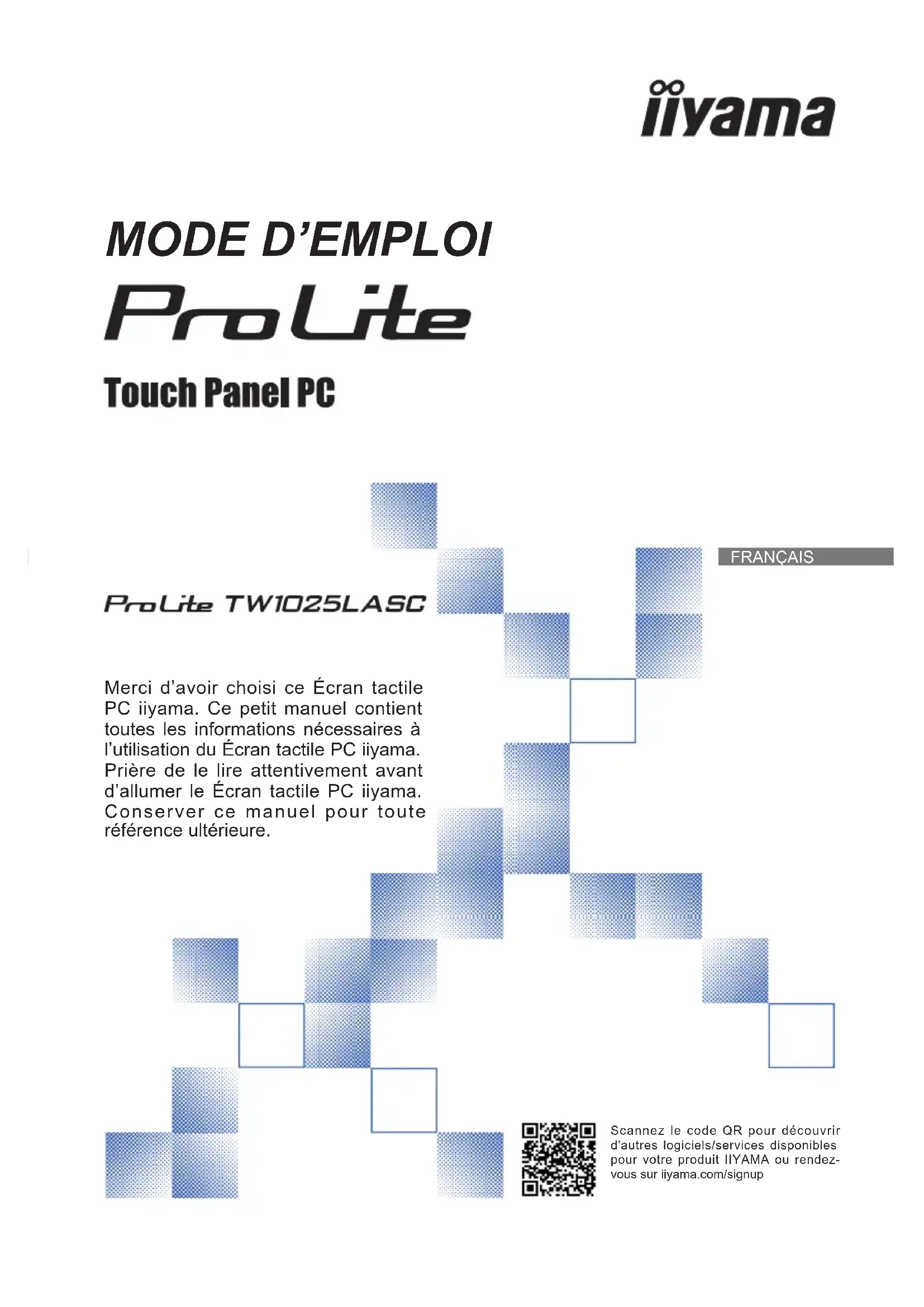 Merci d’avoir choisi ce Écran tactile PC iiyama. Ce petit manuel contient toutes les informations nécessaires à l’utilisation du Écran tactile PC iiyama. Prière de le lire attentivement avant d’allumer le Écran tactile PC iiyama. Conserver ce manuel pour toute référence ultérieure. Scannez le code QR pour découvrir d'autres logiciels/services disponibles pour votre produit IIYAMA ou rendez- vous sur iiyama.com/signupFRANÇAIS